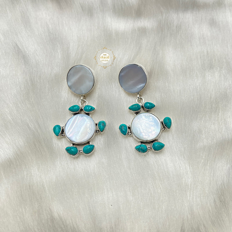 Introducing our exquisite 925 Silver Mother of Pearl (MOP) and Turquoise Earrings – a perfect blend of elegance and natural beauty. Crafted with precision and passion, these earrings are designed to add a touch of sophistication to any ensemble. The combination of Mother of Pearl and Turquoise creates a harmonious balance, symbolizing tranquility and grace. The intricate detailing of the silver setting enhances the overall design, making these earrings a true work of art. Whether you're dressing up for a special occasion or adding a touch of refinement to your everyday look, these earrings are the perfect accessory. * MATERIAL : STERLING SILVER 92.5