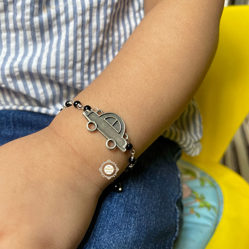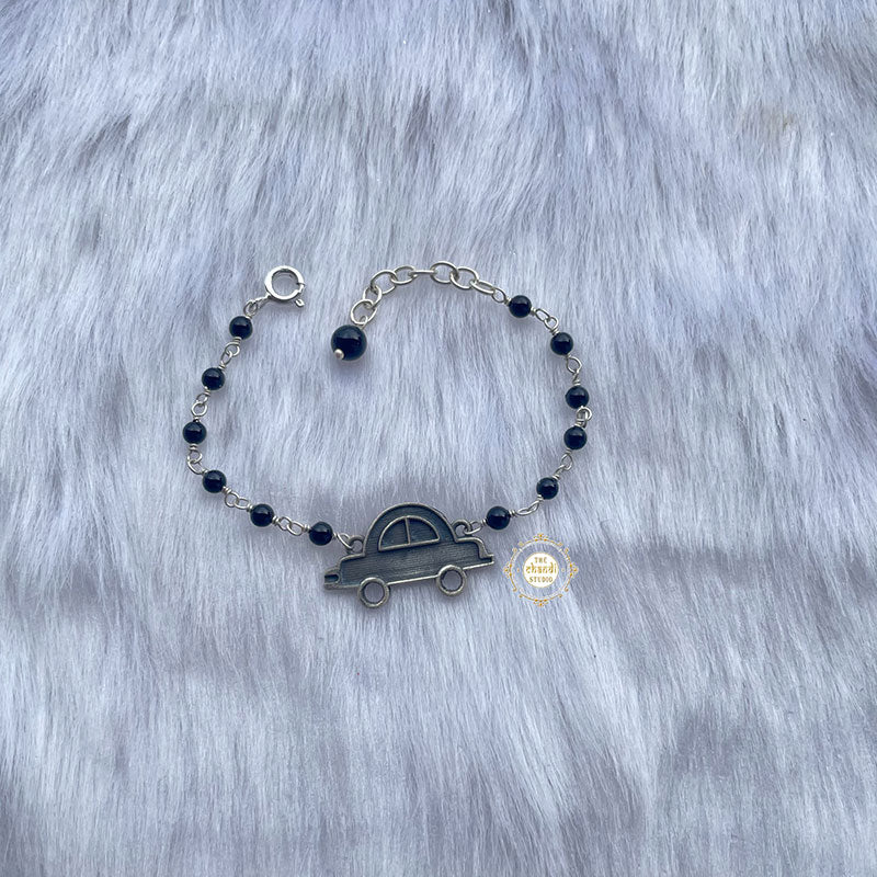 A Joy Ride Car Kids Nazaria Bracelet   Do you know what the incredible thing about babies is? They are like tiny bunches of contentment. Like the fortune in a cradle. For all your little ones who obsess about cars, and for those creative creatures who are finding joy in the simplest of things – a cardboard car, for example, or an imaginative driving game then this cute 'A Joy Ride' Car Nazaria Bracelet is a perfect gift to make these little cuties cheerful. These Nazaria on a newborn's wrist will make it more cuter. Tie this cute car Nazaria on the wrist of your little bundle of joy solely from our studio to ensure that all the evil eye or ‘Nazar’ stays off from the baby, thus safeguarding them from negative attention. Min. Length – 5 inches Max. Length – 6 inches MATERIAL : STERLING SILVER 92.5 *Price mentioned is for a single piece only.