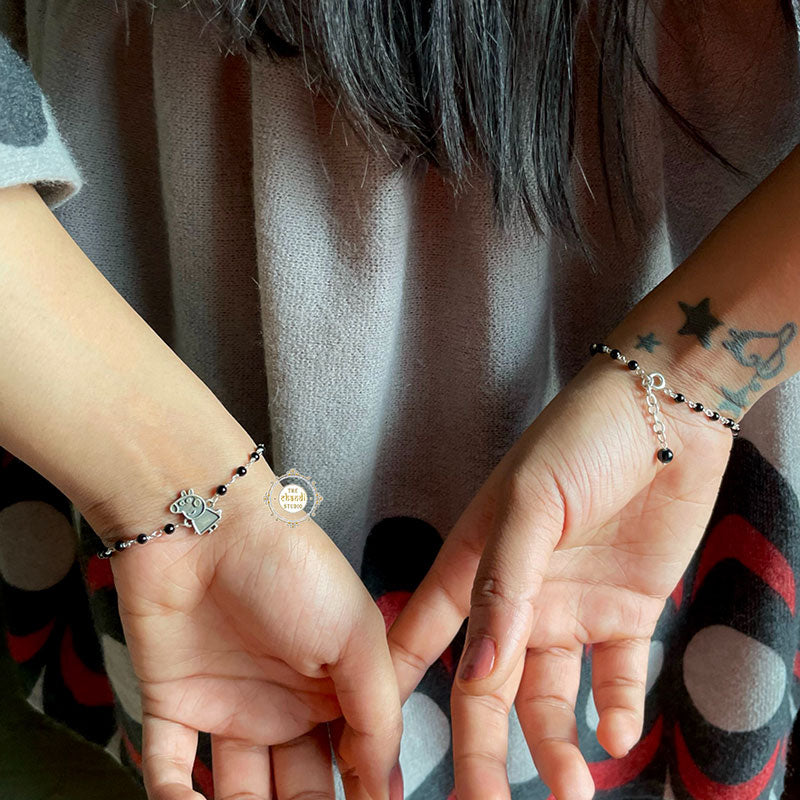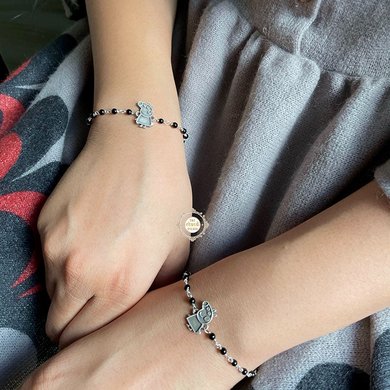 Adorable Peppa Pig Nazaria Bracelet   Have you ever realized that when you have got some leisure time after the kidlets have gone to sleep, you are still watching Peppa pig, or is Peppa Pig your ultimate boredom killer? Then welcome to Peppa fam!! Peppa is a pig of the people, her naive silliness is a pleasant distraction from the mayhem that surrounds us. Toddlers and preschoolers (and more than a few adults, too) like Peppa, and for good reason. Entrust a cute look to your wrist and revamp the inner kid in you with this bracelet from our studio. These bracelets are exclusively crafted from silver and display a refined finish. Adorable Peppa Pig Nazaria bracelets are loved by all! Min. Length – 6.5 inches Max. Length – 7.5 inches MATERIAL : STERLING SILVER 92.5 *Price mentioned is for a single piece only.