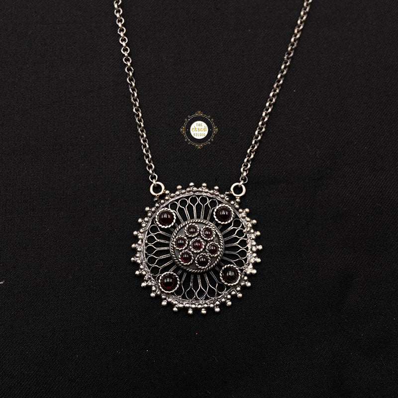 Unlock the power of positive energy and spiritual harmony with the Advitya Chakra Necklace. This captivating piece of jewelry combines ancient wisdom and modern design to create a harmonious balance that resonates with your inner self.   Pendant : Length - 4.4 cm | Width - 4.4 cm Chain : 22 inch with S Lock   * MATERIAL – STERLING SILVER 92.5