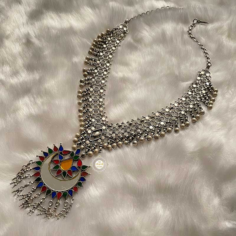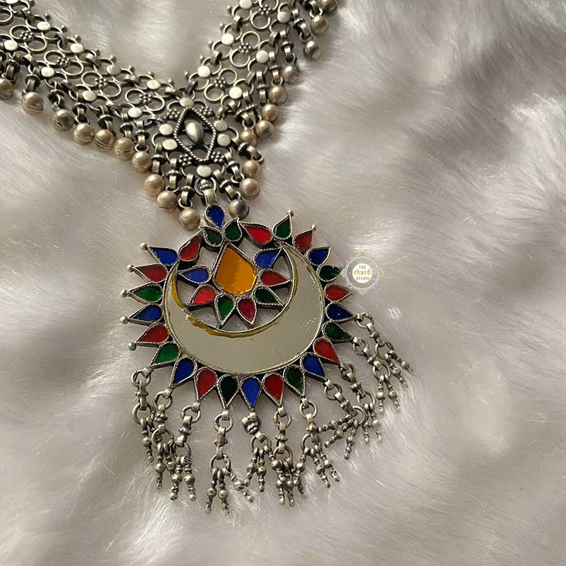 A bold piece with details, drama, culture & colorful twist. PS : ghungroos make tinkling sound. Length - 17.5 Inch (Inclusive Pendant) Width - 2.5 Inch Length of Links- 7.5 Inch MATERIAL : STERLING SILVER 92.5