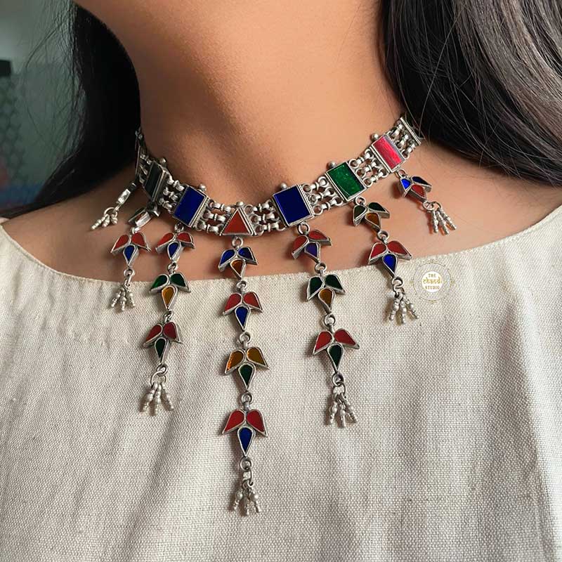 Afghan Glass Jharna Necklace, full of colors, drama, details & culture. With this kind of clean detailing & exquisite glass work, give your jewelry box an androgynous edge with this necklace. Length – 8′ Inches & Width – 4′ Inches Length of Links- 6′ Inches MATERIAL - STERLING SILVER 92.5%