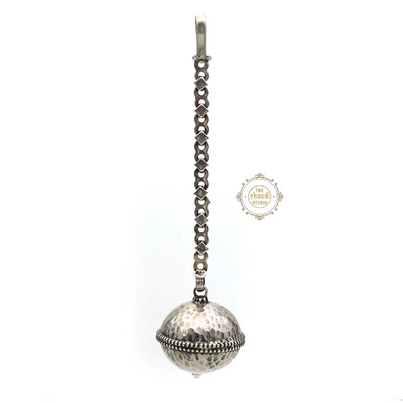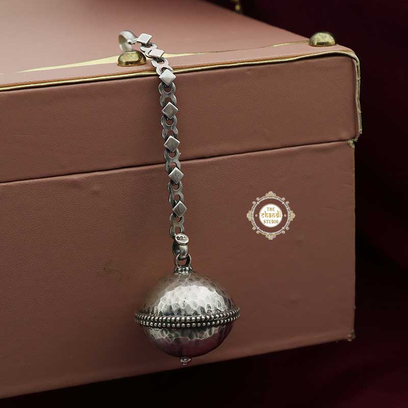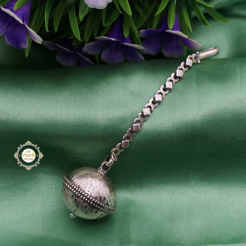 The maang tika is called 'Rakhdi' or 'Borla'. It is a signature piece of the state because unlike other styles, it usually ends in a huge bell-shaped or spherical piece embellished with precious stones.
