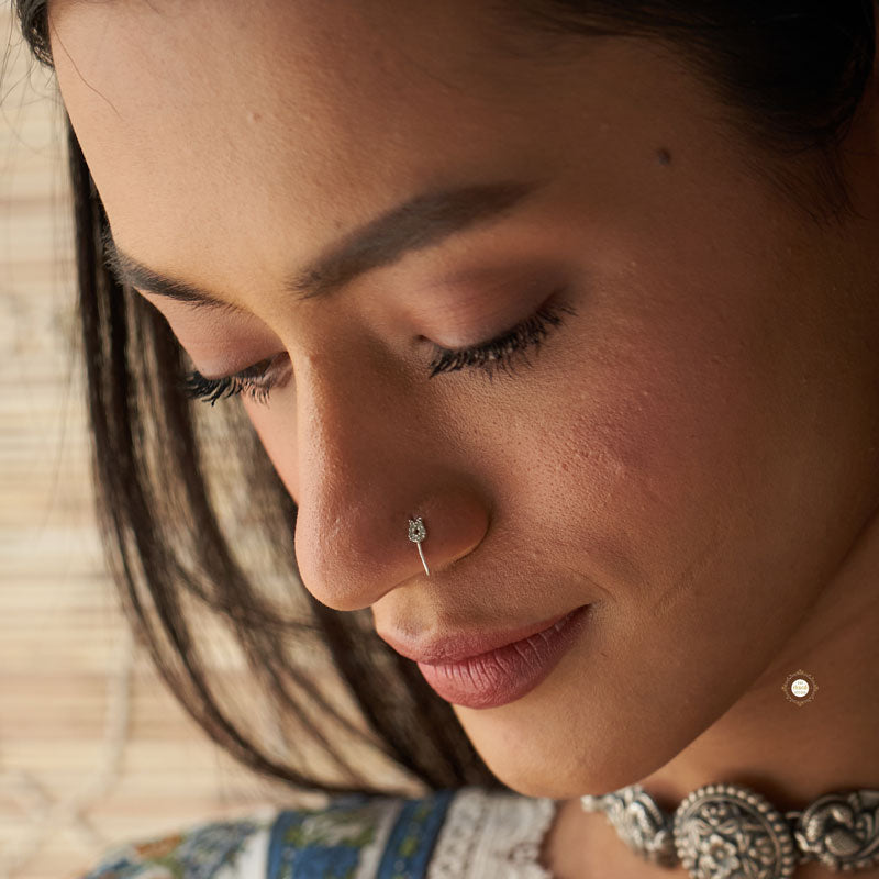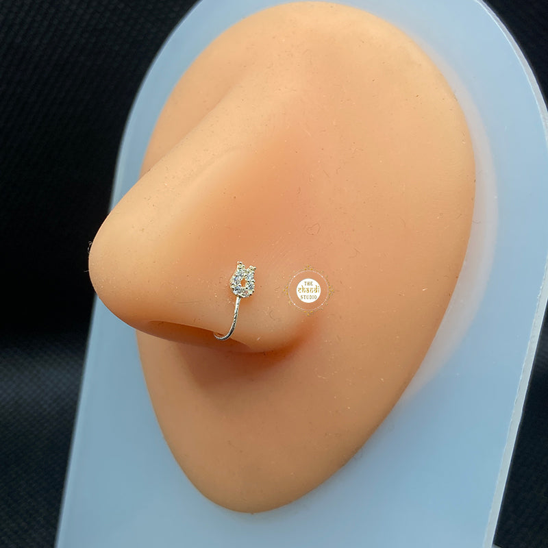 Introducing our 'Blooming Flower' Clip-On Nosepin, a stunning accessory that embodies the beauty of nature in every detail. This exquisite nosepin features a blooming flower design crafted with intricate detailing and adorned with shimmering zirconia stones, creating a mesmerizing and elegant look.