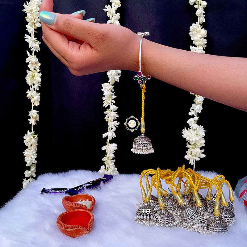 *Bangle is for photography purpose only. Price mentioned is for the lumba rakhi only. A sibling may be the keeper of one's identity, secrets, vulnerabilities - the only person with the keys to one's unfettered, more fundamental self. Rakhi is a celebration of this pure bond that may be out of blood relationship or by behaviour. This Chuda Rakhi by The Chandi Studio celebrates the bond between sisters, brothers, and anyone who held your back in the toughest of times. One for the person you call home. *Every package comes with Roli, Chawal and a Dairy Milk.