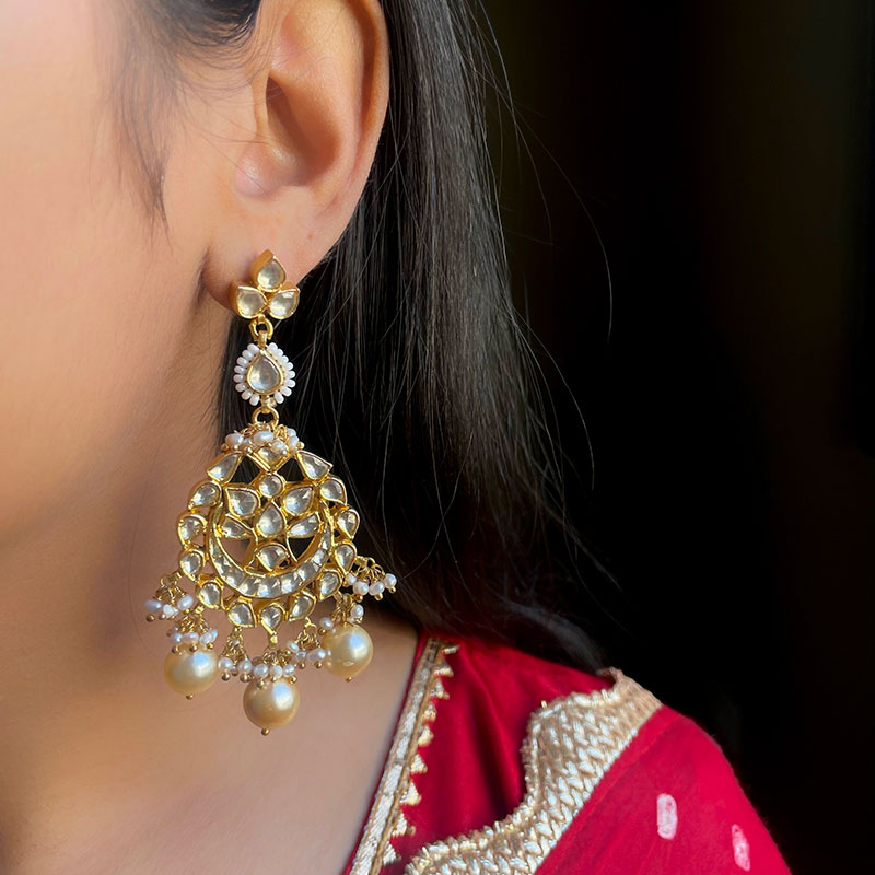 From ancient times to the modern era, Chaandbalis have always been acquired in securing a special room in the culture as well as in every woman’s jewelry box. Chaandbali Full Gold Earring from our studio is one such artistic pair of stunning earrings that is sure to turn heads!! Wear this luxurious piece with a lehenga choli to complete your traditional look. You can also glamorize the look by pairing concurrently these pair of chaandbali with your Indian Dresses. Material : Sterling Silver 92.5%
