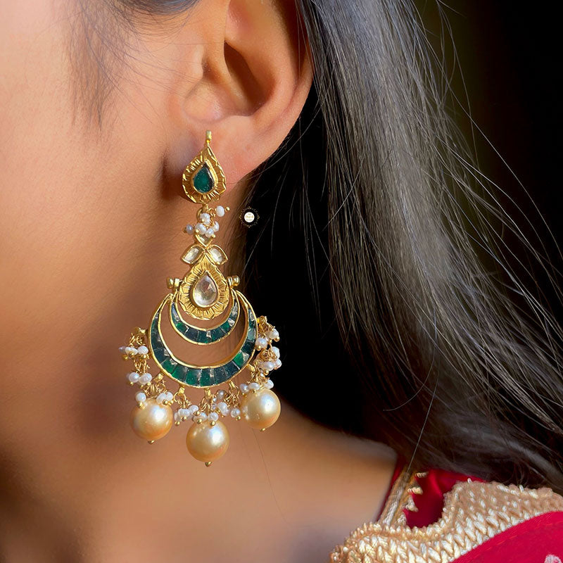 From ancient times to the modern era, Chaandbalis have always been acquired in securing a special room in the culture as well as in every woman’s jewelry box. Chaandbali Full Gold Earring from our studio is one such artistic pair of stunning earrings that is sure to turn heads!! Wear this luxurious piece with a lehenga choli to complete your traditional look. You can also glamorize the look by pairing concurrently these pair of chaandbali with your Indian Dresses. Material : Sterling Silver 92.5%