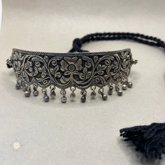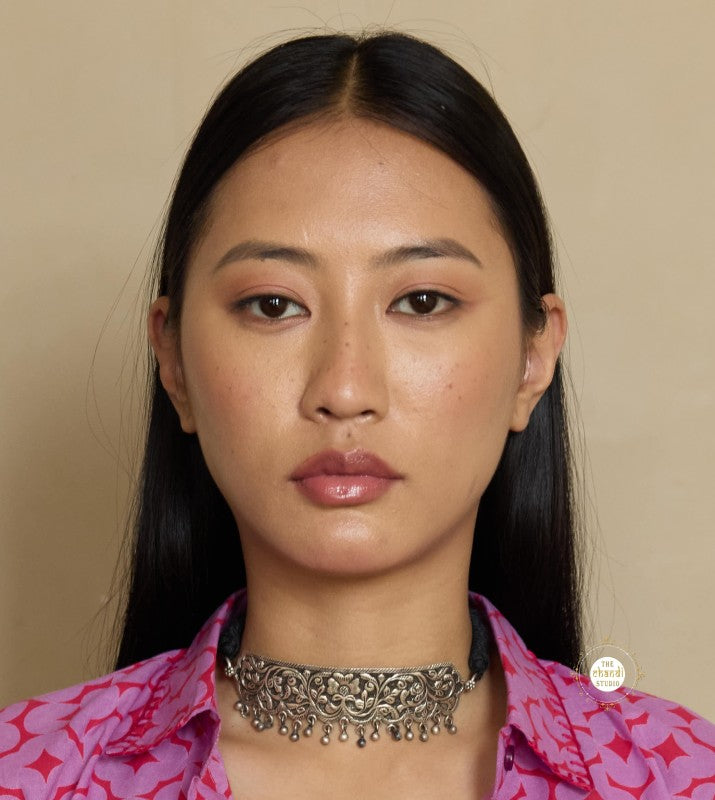 The Chitai Thread Necklace features intricate silverwork on a bold, handwoven thread, creating a striking blend of elegance and tradition. Perfect for cultural events, this necklace adds sophistication to any attire.