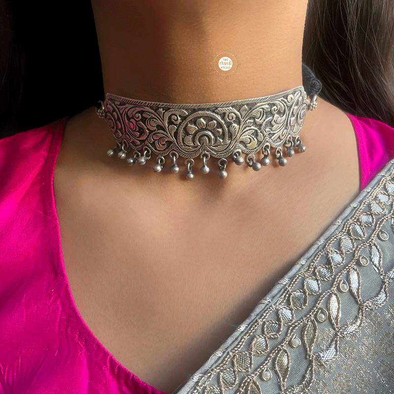 The Chitai Thread Necklace features intricate silverwork on a bold, handwoven thread, creating a striking blend of elegance and tradition. Perfect for cultural events, this necklace adds sophistication to any attire