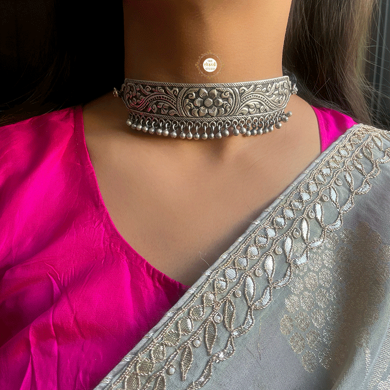 The Chitai Thread Necklace features intricate silverwork on a bold, handwoven thread, creating a striking blend of elegance and tradition. Perfect for cultural events, this necklace adds sophistication to any attire.