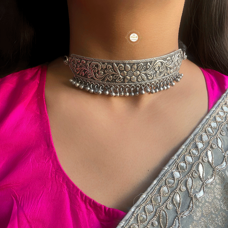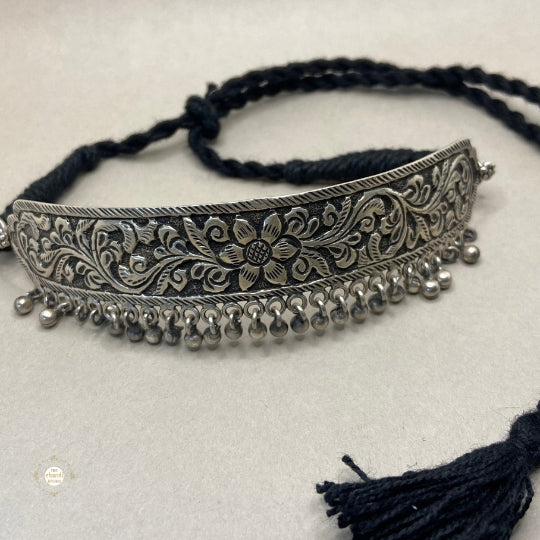 The Chitai Thread Necklace features intricate silverwork on a bold, handwoven thread, creating a striking blend of elegance and tradition. Perfect for cultural events, this necklace adds sophistication to any attire.