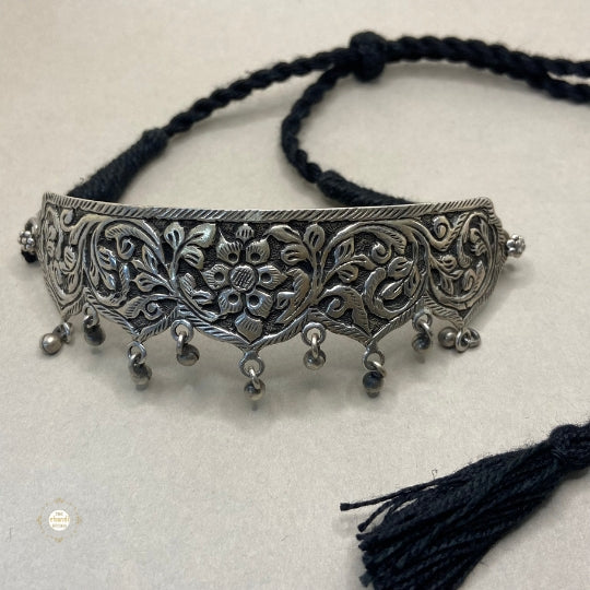 The Chitai Thread Necklace features intricate silverwork on a bold, handwoven thread, creating a striking blend of elegance and tradition. Perfect for cultural events, this necklace adds sophistication to any attire.