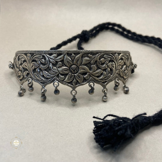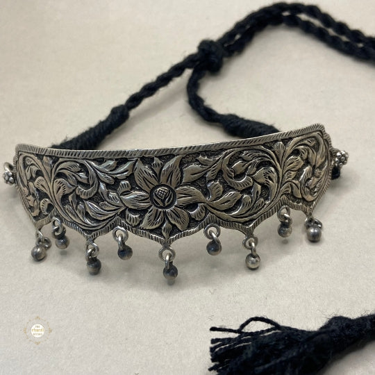 The Chitai Thread Necklace features intricate silverwork on a bold, handwoven thread, creating a striking blend of elegance and tradition. Perfect for cultural events, this necklace adds sophistication to any attire