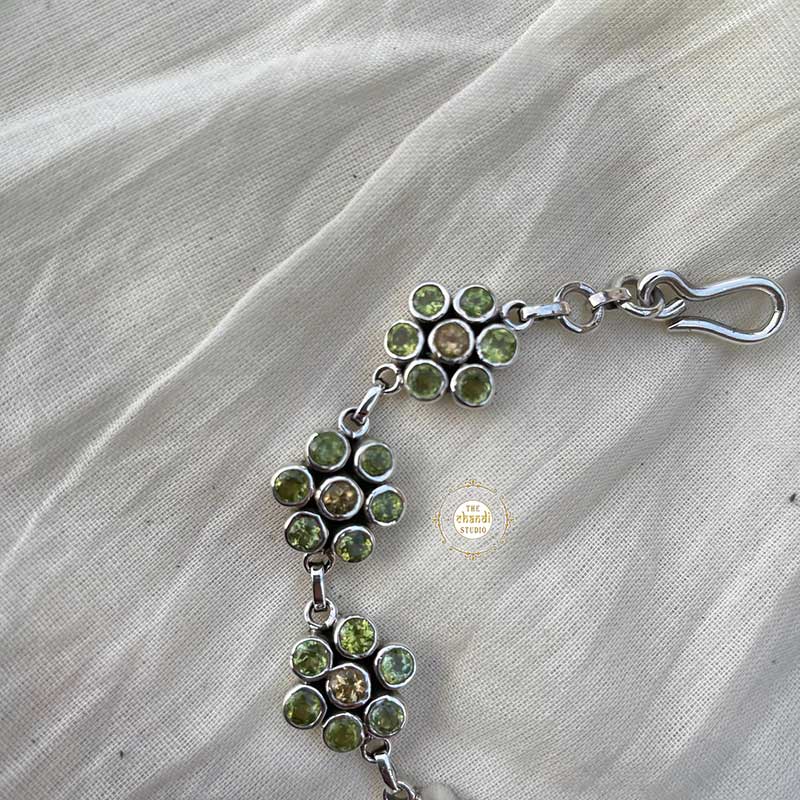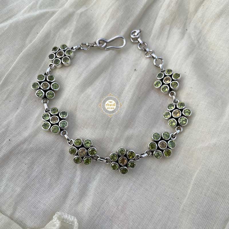 Citrine Peridot Flower Bracelet with semi precious stone   Steal the show and add color to any occasion as you reveal your whimsical side with this bracelet. Citrine is the gemstone to bring about success and prosperity. Due to this, it is being named as ‘Success Stone’. It is a manifestation of wealth and good luck. Peridot increase strength and vitality in people. It has a calming effect on the wearer. It is also said to bring happiness and warmth in the lives of people. Min. Length – 6.5' inches Max. Length – 7.75' inches