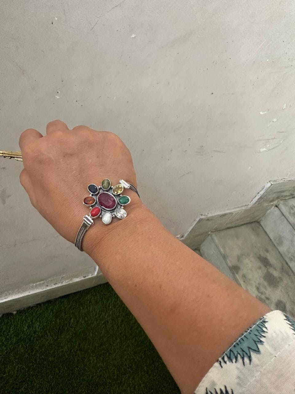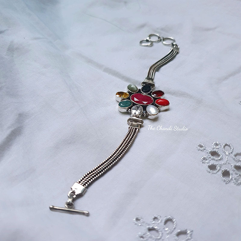Classic Navratna Bracelet Do you have a statement piece of jewellery that is your go to when everything else fails? We admit to being a little obsessed with Navratnas. Dive into a world full of colors & love with our Navratna Chain Bracelet. Min. Length – 6.5 inch Max. Length – 8 inch The price mentioned is for single piece.