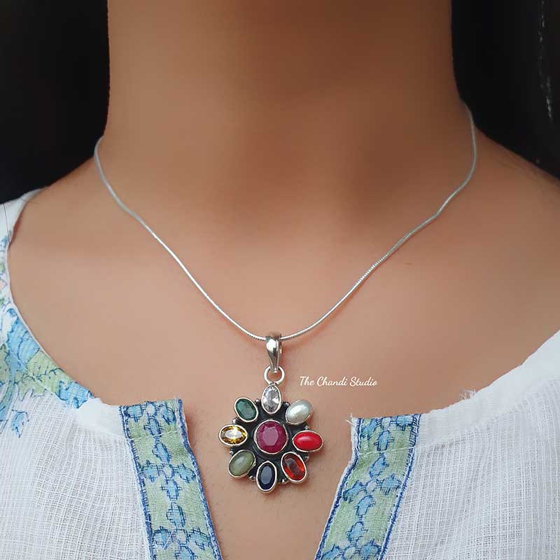 Do you have a statement piece of jewellery that is your go to when everything else fails? We admit to being a little obsessed with Navratnas. Dive into a world full of colors & love with our exotic Navratna collection. Attract positive vibes by wearing all the nine gemstones studded Navratna pendant, easiest one to throw on & look your best. Wear this statement pendant from our Navratna collection and get some Instagram worthy selfies and photos, easiest one to throw on & look your best. Ethnic outfits, off-shoulder blouses, embroidered skirts, cotton salwars and silk sarees - be the best dressed, everyday. MATERIAL : STERLING SILVER 92.5 *Price mentioned is only for the pendant.
