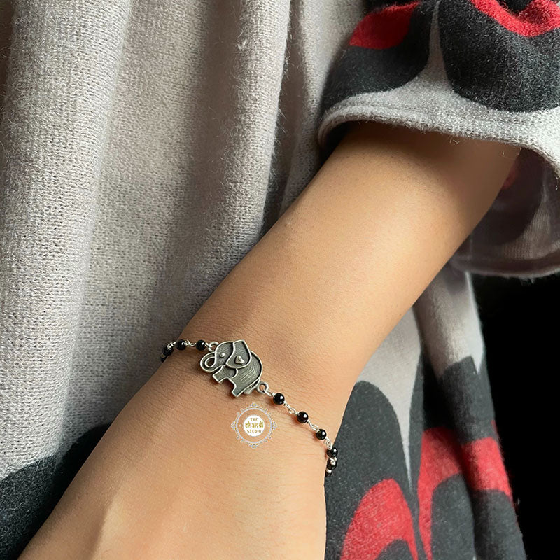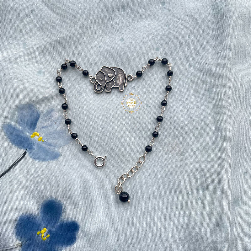 Comfy Elephant Nazaria Bracelet   Elephants are powerful and protective, and they are faithful to their family. Inspired by this majestic creature, our team decided to include this symbol of familial love in our nazarias but with a twist of adorability. This is a unique Indian bracelet used to ward off the evil around them. In the fashion world, the highlight is the use of black beads. Nazarias are integral to Indian adornment, after all, Indians are traditionally raised wearing nazarias right from their childhood. As the phrase goes “An elephant never forgets” so this Comfy Elephant Nazaria bracelet will always make an unforgettable gift for your loved ones, to let them feel you’re thinking of them. Min. Length – 7 inches Max. Length – 8 inches MATERIAL : STERLING SILVER 92.5 *Price mentioned is for a single piece only.