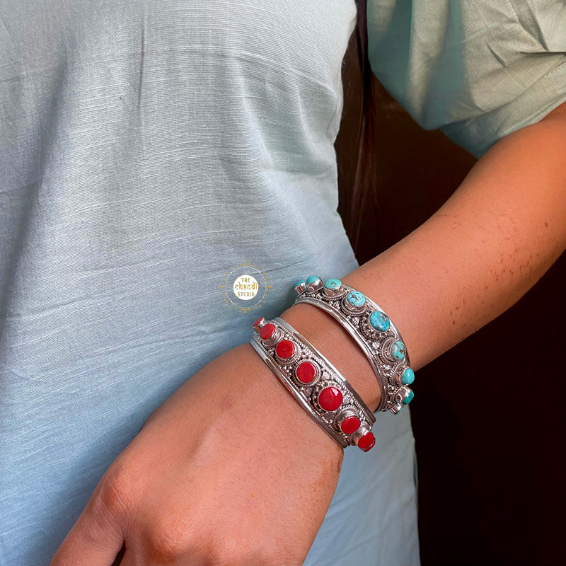 Elevate your accessory game with our Coral Stone Kada, a stunning open cuff featuring real semi-precious coral stones and intricate rava work. Crafted with high-quality silver, this kada boasts a smooth, polished finish that enhances the natural beauty of the coral stone, creating a striking contrast that is sure to turn heads. Crafted with high-quality silver and featuring intricate rava work, this kada is a testament to our commitment to quality craftsmanship and attention to detail. The real semi-precious coral stones add a pop of vibrant color to the sleek and stylish design, creating a stunning contrast that's both eye-catching and elegant. Whether you're dressing up for a special occasion or simply adding a touch of elegance to your everyday look, the Coral Stone Kada is the perfect choice. So why wait? Make a statement with this timeless piece today, and watch as heads turn and compliments flow your way. MATERIAL – STERLING SILVER 92.5%