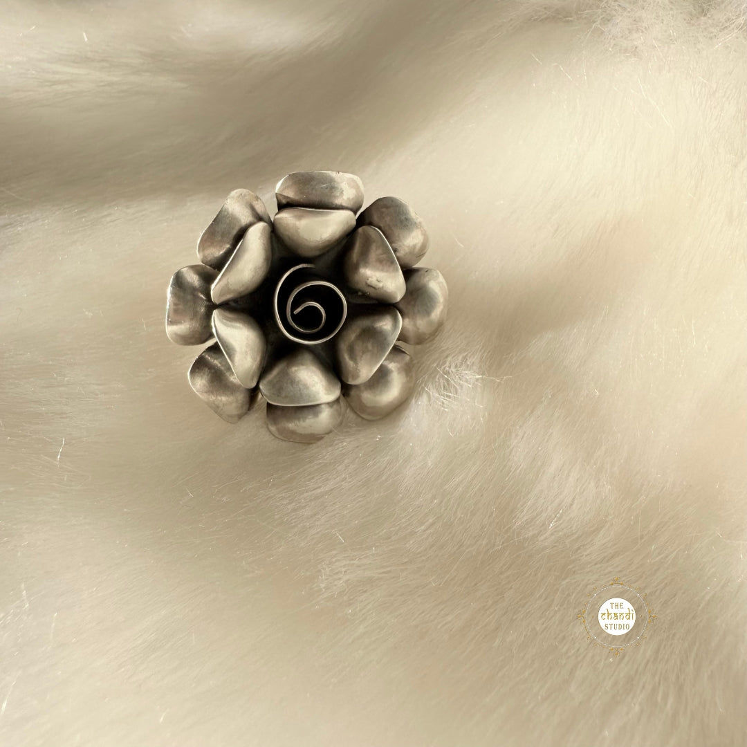 Elevate your style with the Dilkash Rose Ring crafted in sterling silver with an intricate floral design. A statement piece that adds elegance and charm to any look effortlessly.