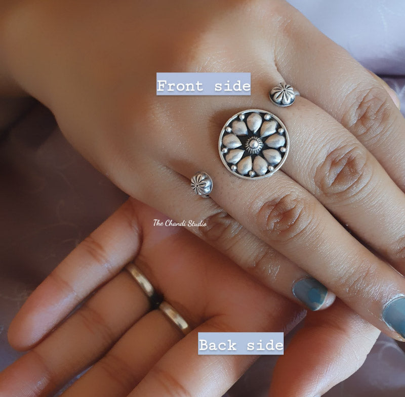 Sometimes, one is never enough. Designed to resemble two individual rings, our double finger ring gracefully stretches across two digits. The playful piece is topped with dainty flower in the middle & two tiny flowers at the sides. Also, it's lightweight, super convenient to wear & goes with all styles.
