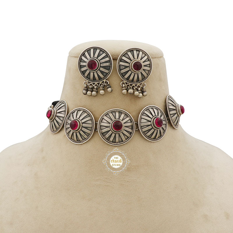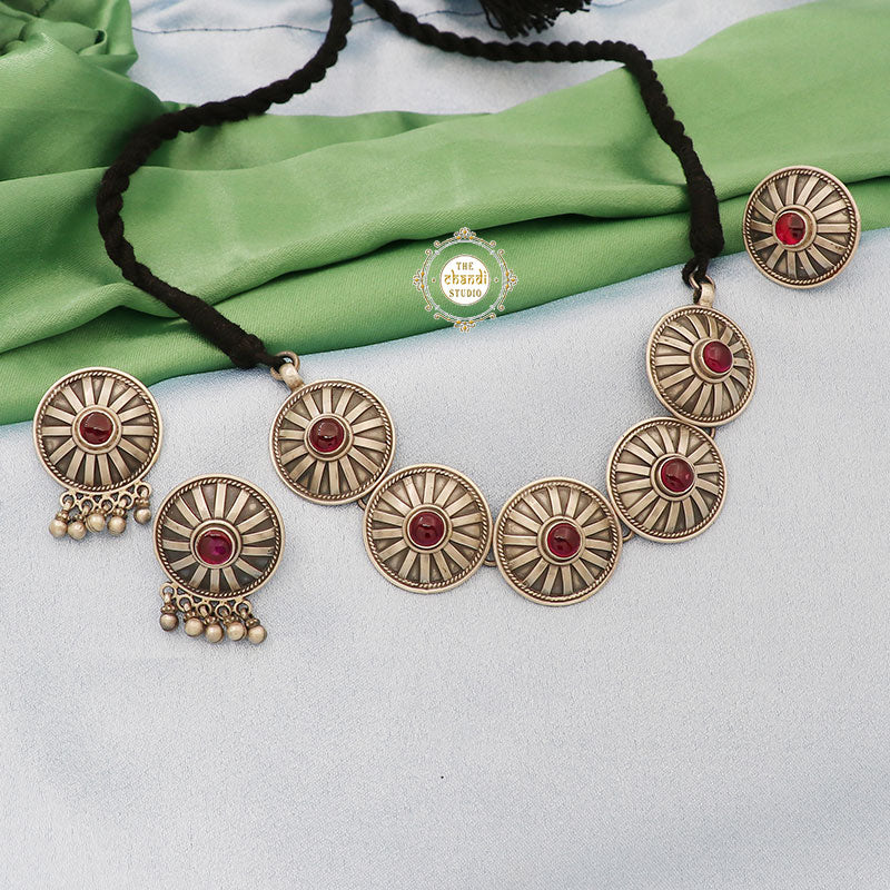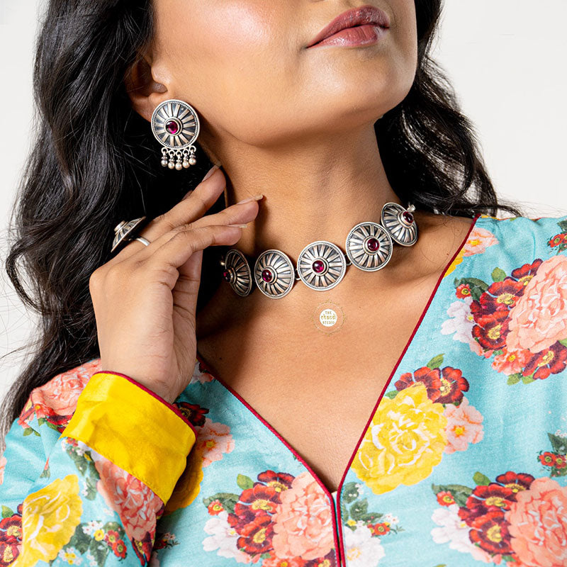 Dilkash Romantic Ruby Chakra Necklace Set – Embrace elegance with this enchanting set featuring a radiant ruby centerpiece surrounded by intricate chakra designs. Ideal for romantic occasions, its vibrant gemstones and delicate craftsmanship enhance any look. Perfect for adding a touch of sophistication and passion to your ensemble.