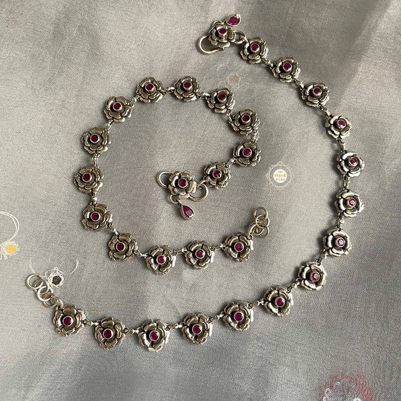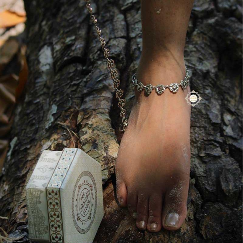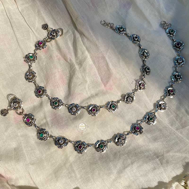 Dilkash Rose Anklet   Elegant and ethereal, this floral anklet has our heart! It beautifully decorates your ankle with delicate beautiful stone studded roses.   Length- 10.5 inches Material : Sterling Silver 92.5