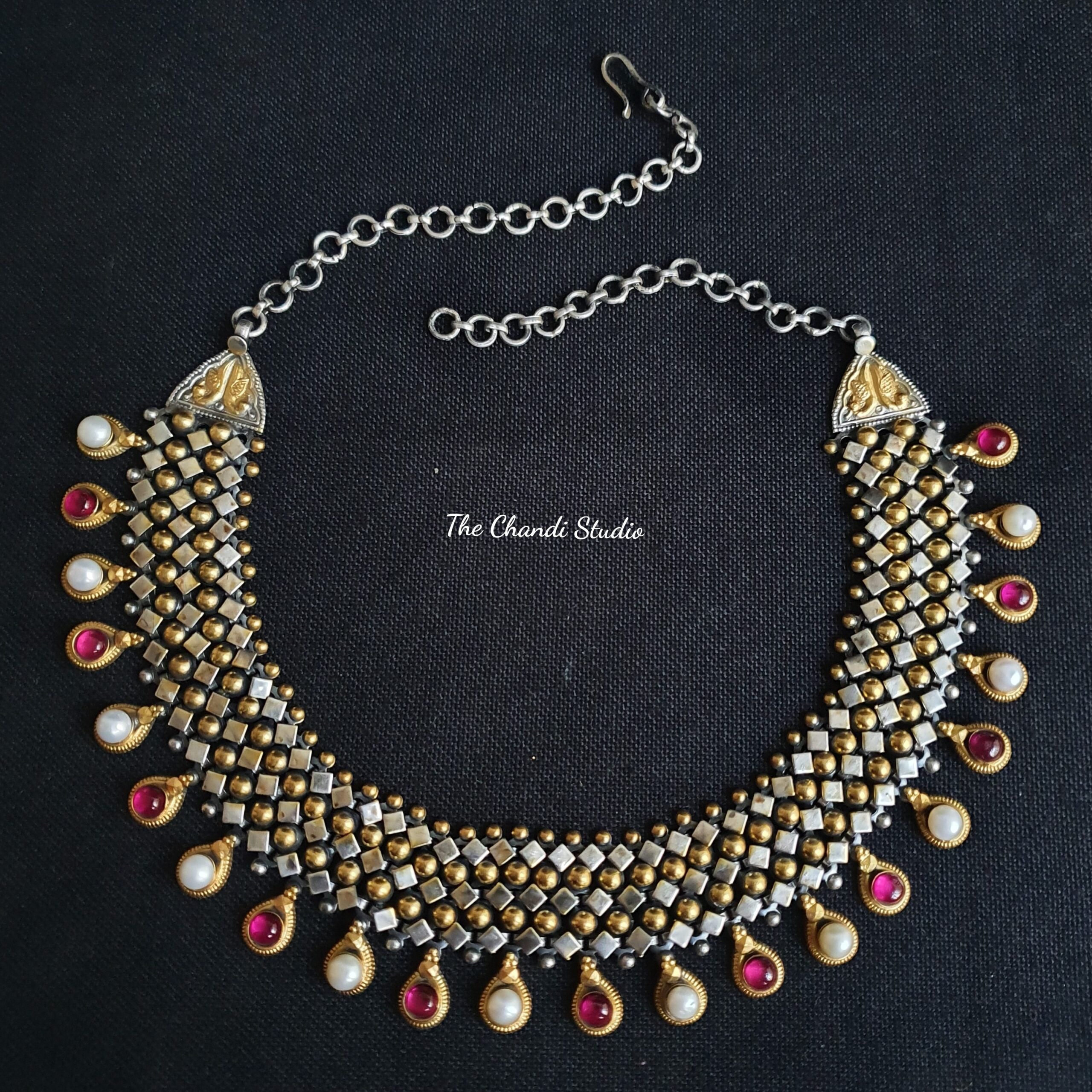"DO RUKHA" With simple chatai work, ruby & pearl drops, this piece has turned out to be so pretty. MATERIAL : STERLING SILVER 92.5
