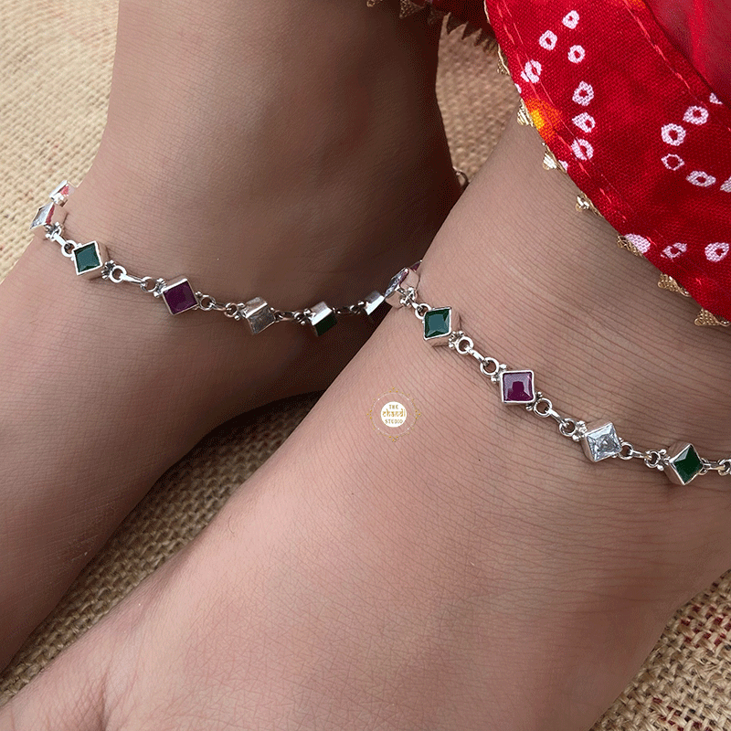 The Multi Stone Anklet features delicate stones set in a shimmering silver chain, adding an enchanting touch to your look. Perfect for any occasion, it brings elegance and subtle sparkle to your style.