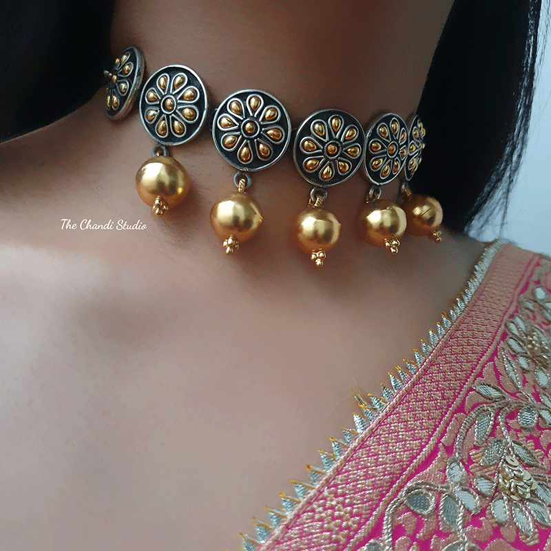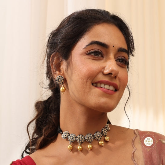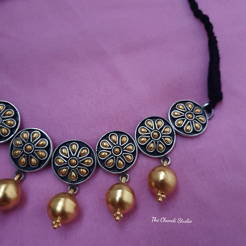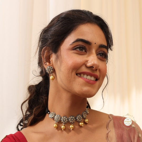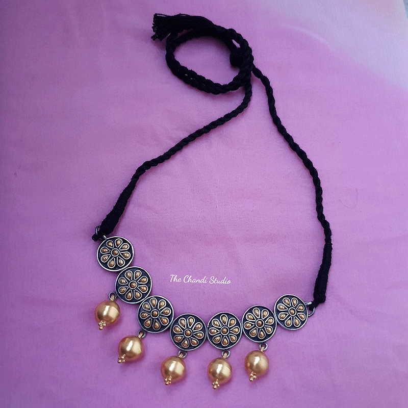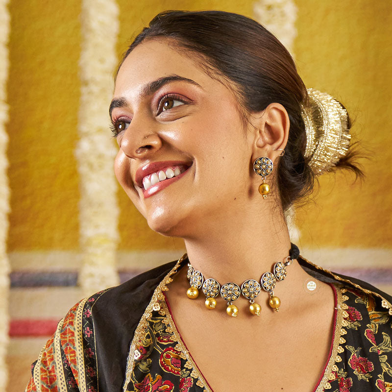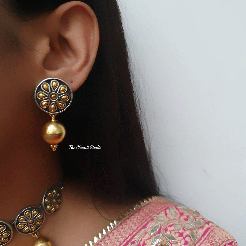 Flower motif ball drop necklace set, a classic design for festivities. Finished with an adjustable cotton thread.
