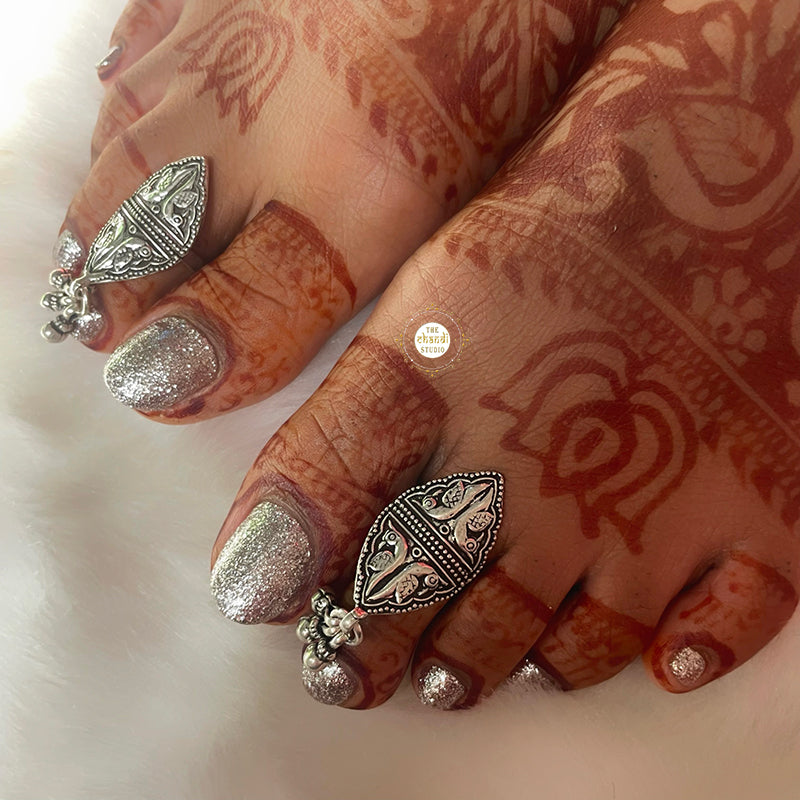 An embossed parrot ghungroo toe ring is a traditional Indian accessory worn on the toes. It features an embossed design of a parrot and ghungroos, which are small bells that tinkle with movement. The toe ring adds a unique touch of ethnic elegance to any outfit, and can be worn on special occasions or as a daily accessory. Price mentioned is for a Pair. Size – Adjustable