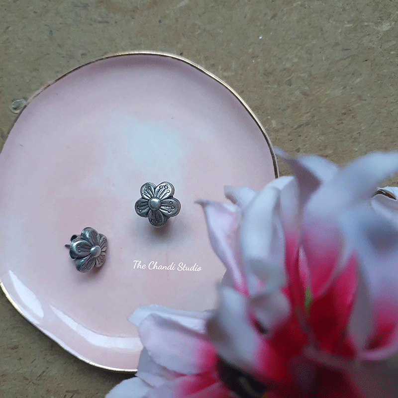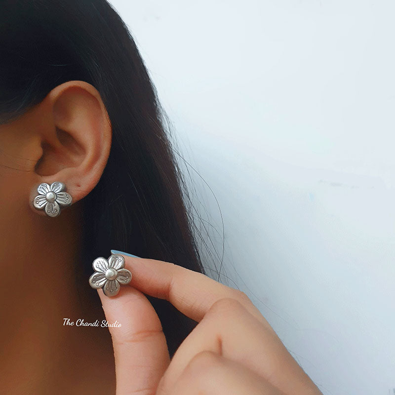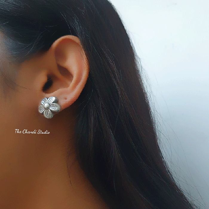Halka Phulka, always a flower child ! Tired of the heavy statement earrings? Give your earlobes some rest with the minimal floral studs. MATERIAL : STERLING SILVER 92.5
