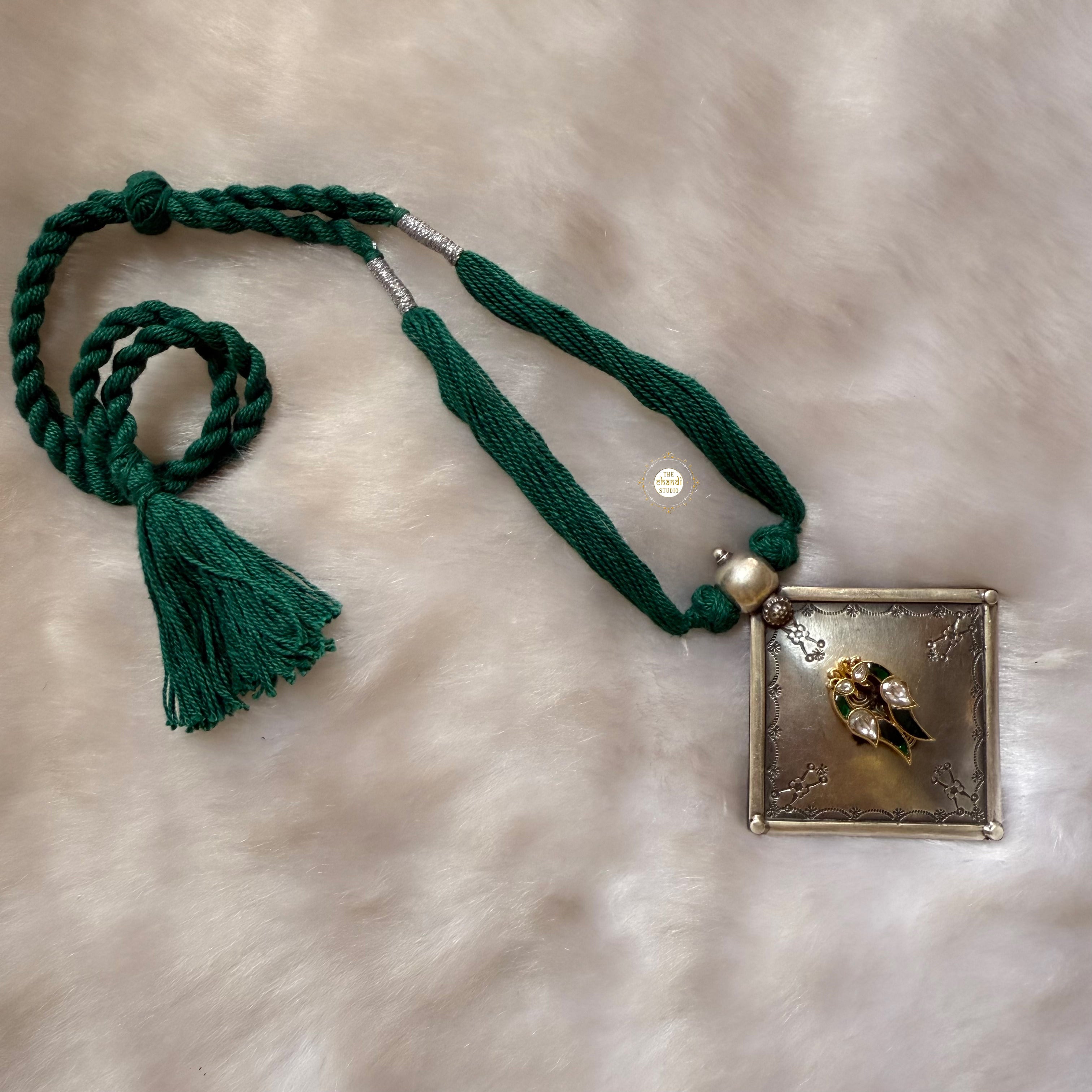 Elevate your ethnic style with the Rajwada Square Thread Necklace—a handcrafted silver-tone statement piece featuring floral accents and soft green threads. Perfect for festive looks, boho vibes, or everyday elegance.