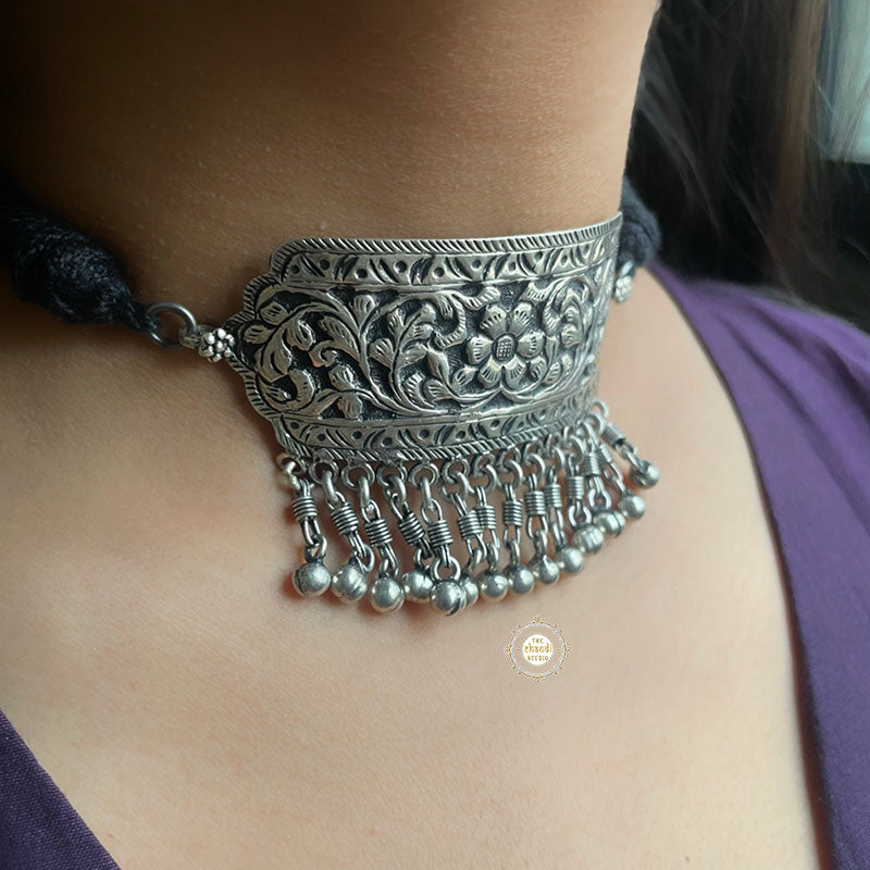 The floral motifs carved on the metal moon takes you to the royal state of Rajasthan. Timeless and elegant, Floral Embossed Ghungroo Thread Choker can be teamed up with absolutely anything from a lehenga or sharara to an anarkali or saree. The ghungroo danglers are an added piece of classic handcraft. *Finished with an adjustable cotton thread. MATERIAL : STERLING SILVER 92.5