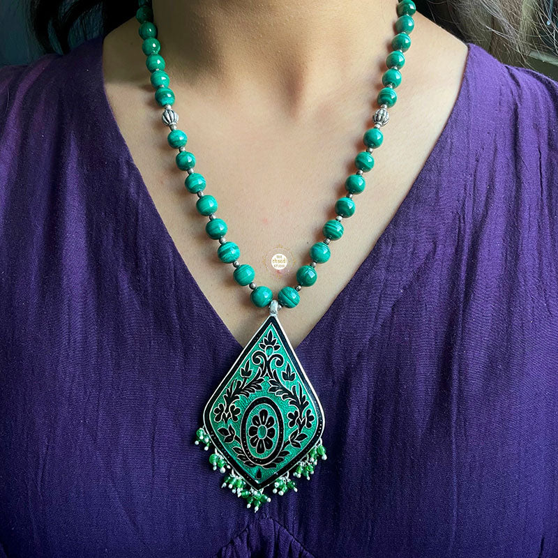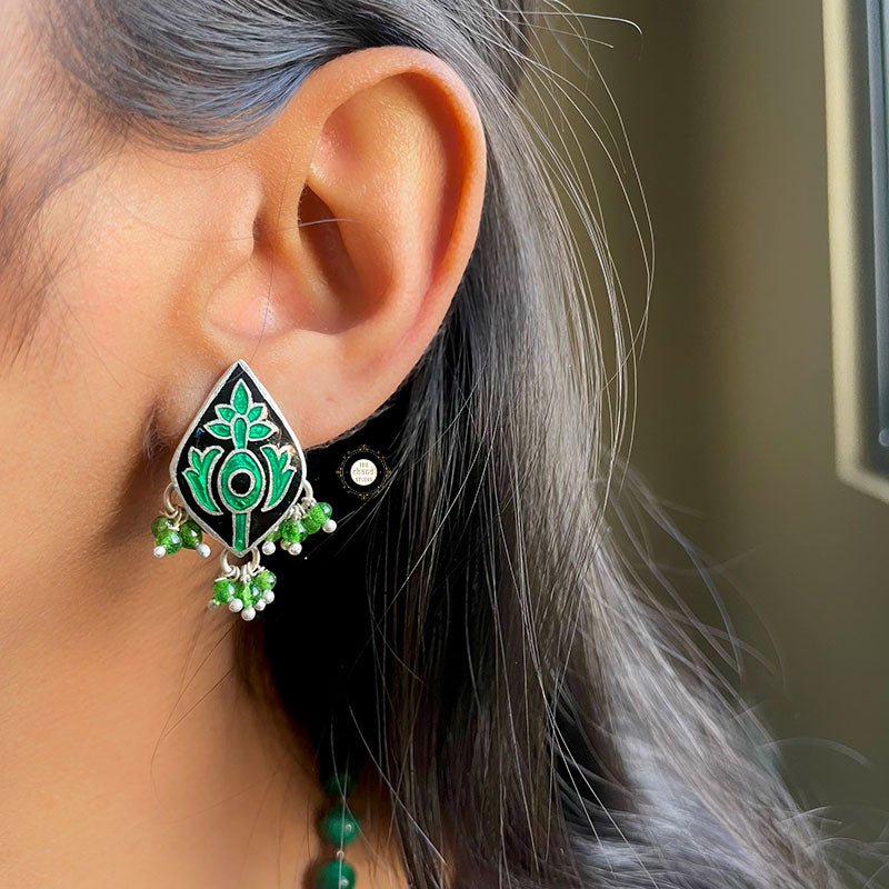 Floral Enamel Necklace Set, where nature-inspired sophistication meets exquisite craftsmanship. Adorned with delicate floral motifs meticulously crafted in vibrant enamel, this set encapsulates grace and refinement.   Each piece in this set is a testament to artistry, featuring a pendant necklace and complementing earrings. The pendant showcases intricate floral patterns, accentuated by radiant enamel hues, while the earrings echo this beauty in their dainty design.   Material – Sterling Silver 92.5%