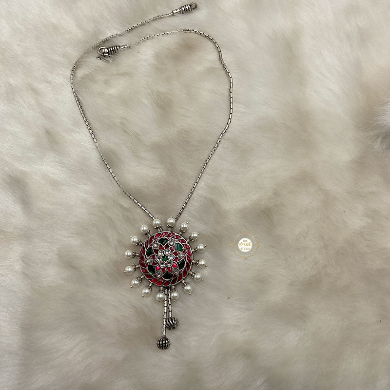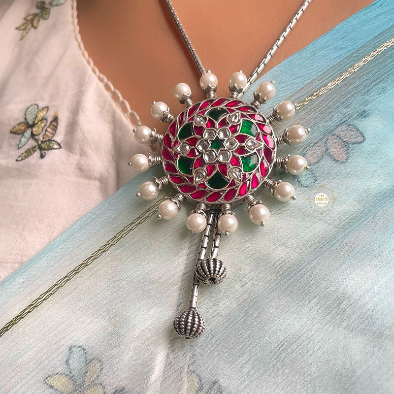 Indulge in timeless elegance with our Floral Kundan Chain Necklace. This exquisite piece showcases the artistry of Kundan jewelry, featuring intricate floral motifs adorned with hand-set Kundan gemstones. Crafted from premium 925 sterling silver, it effortlessly blends tradition with modernity, making it the perfect accessory for any occasion. Shop now and add a touch of opulence to your collection. MATERIAL : STERLING SILVER 92.5