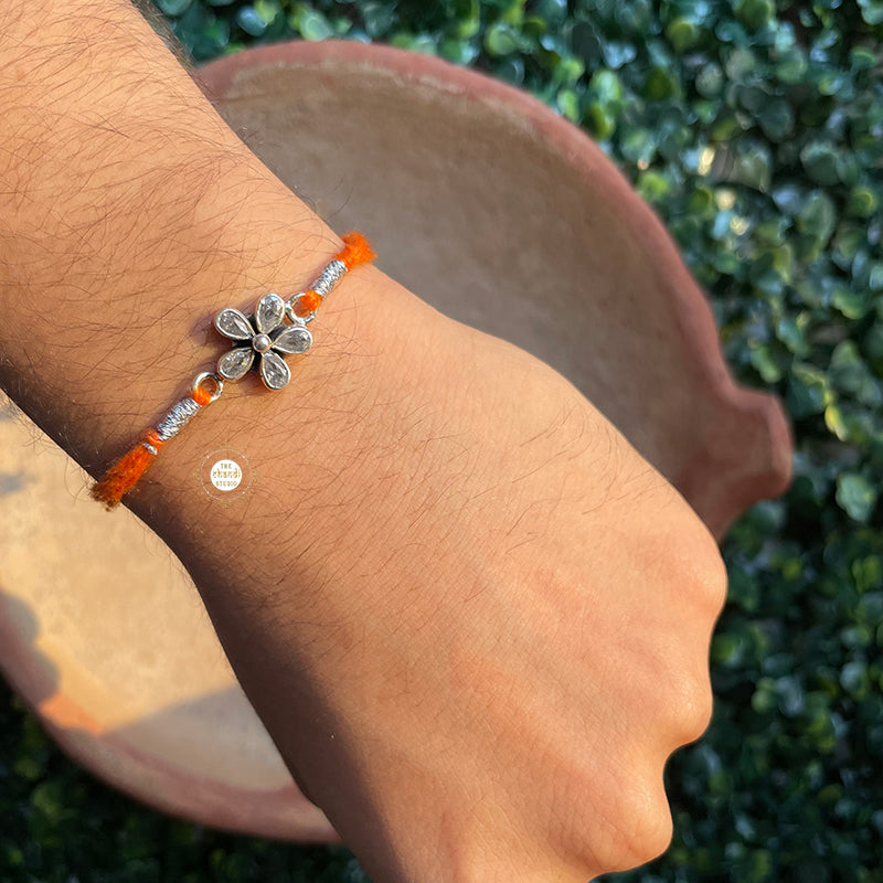 Celebrate the bond of love with the Sterling Silver Floral Grace Rakhi Handcrafted in 92.5 silver, it features an elegant design symbolizing purity, protection, and timeless sibling connection.