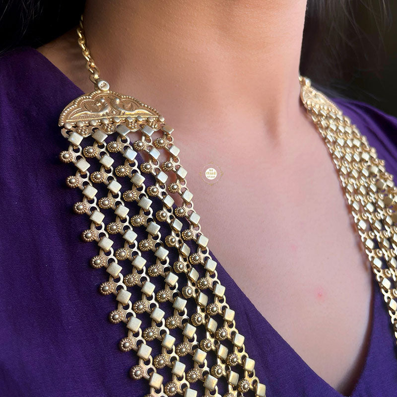 Discover regal elegance with our exquisite Full Gold Maharani Layered Necklace. Adorn yourself with the timeless allure of this handcrafted masterpiece, inspired by the grace of royalty. Indulge in the versatility of this piece, perfect for complementing both traditional ensembles and modern couture. Whether attending a glamorous soirée or seeking everyday luxury, the Maharani Layered Necklace elevates your style effortlessly. Elevate your fashion statement and embrace the heritage of elegance with the Maharani Layered Necklace. Material : Sterling Silver 92.5%