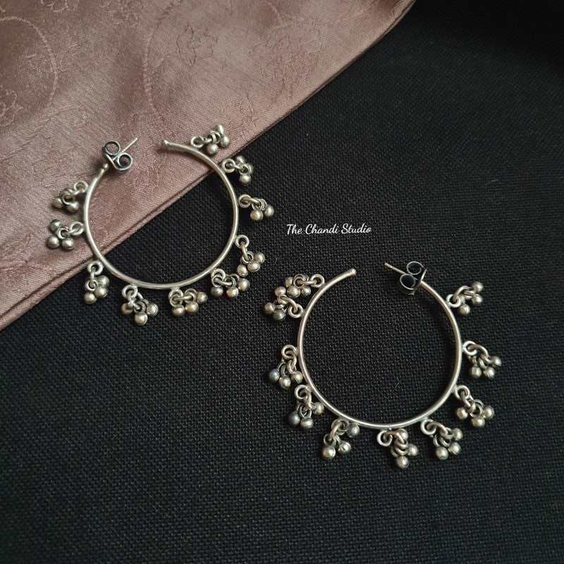 Lunge high on vogue fashion with our unrivaled Ghungroo Hoop Earrings. Revamp your look with these minimalist and elegant earrings to twist the spirit of your fashion sense in all ways aesthetical to boost your natural look effortlessly. A requisite in every women's jewelry box, these hoop earrings will take you stylishly through miscellaneous date nights, spruced up outings with your girls squad, luxurious dinner parties or to add an element of quirkiness to your monotonous days at work. MATERIAL : STERLING SILVER 92.5