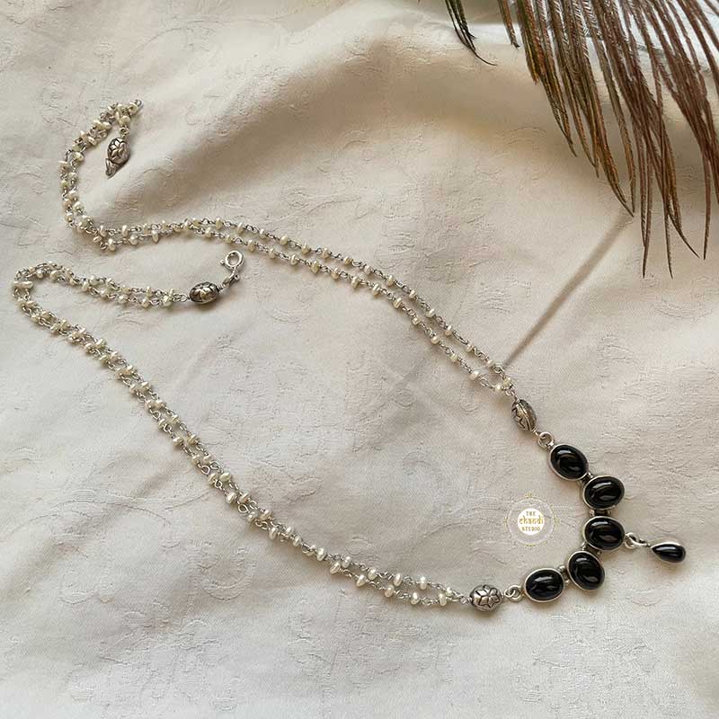 A delicate Black Onyx necklace with freshwater pearls that you'll never want to take off.. YESS! Because it's minimal, lightweight & breezy for everyday comfort :) Necklace Length - 22' Inches Width - 1.5' Inches MATERIAL - STERLING SILVER 92.5%