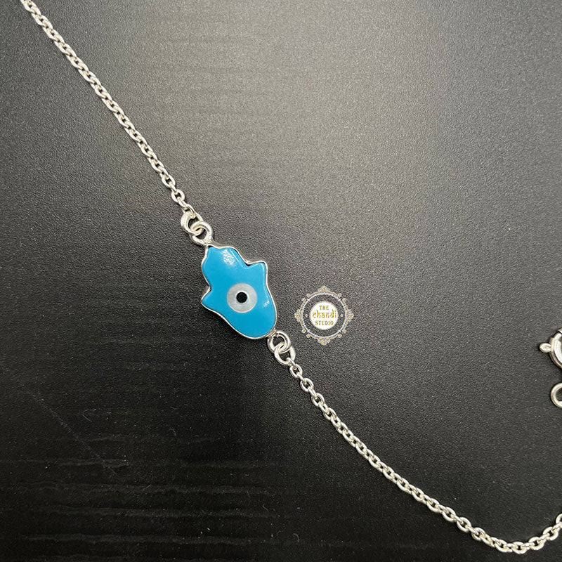 Hamsa Evil Eye Bracelet   According to an old belief, the ancient people began wearing amulets or jewelry with the evil eye symbol to avoid any curse or misfortune. An illustration of fine craftsmanship, the Hamsa Evil Eye Bracelet is solely designed for the soul in love with themselves. Style this beauty with your regular outfits and add a tinge of style statement.   Min. Length – 7.0′ inches Max. Length – 7.5′ inches MATERIAL : STERLING SILVER 92.5