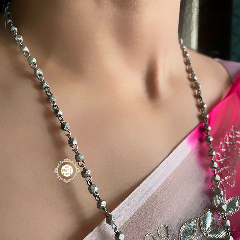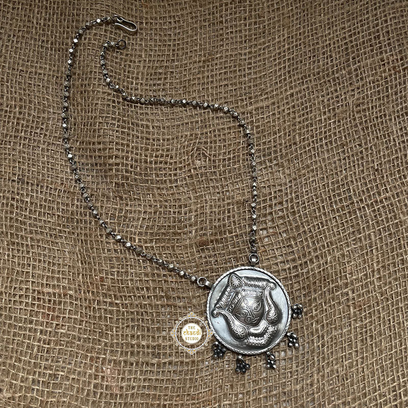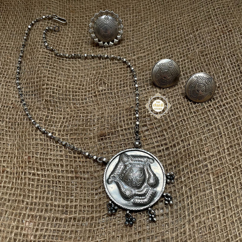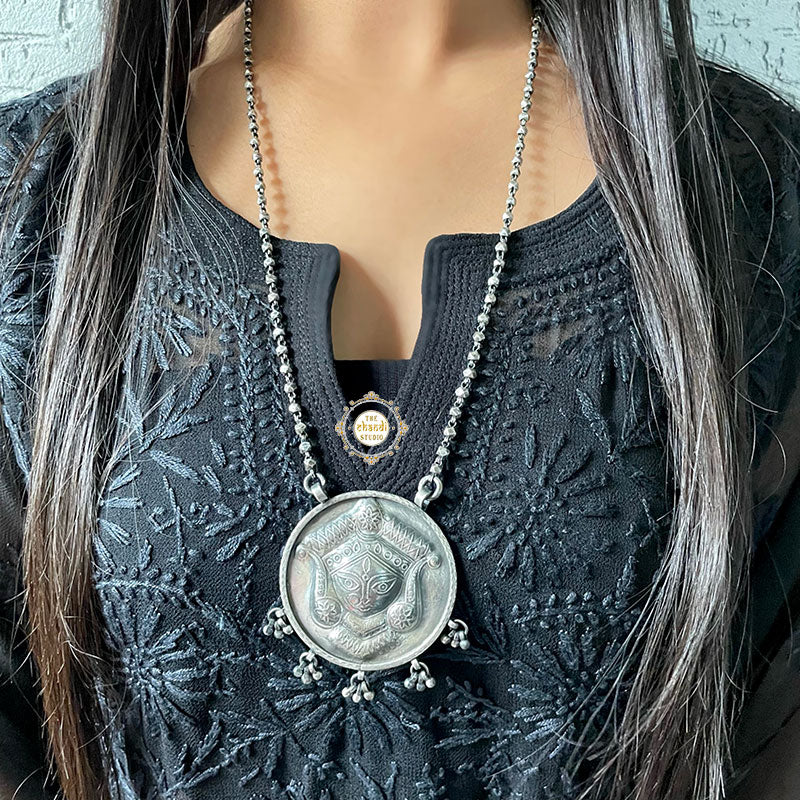 Hand Engraved Durga Collection from our studio is an ode to every maa Durga on this realm. She is Chandi - The matchless one, She is Nitya - The eternal one and She is Annapurna - The giver of food. She is the sun of this solar system, strength to her son, inspiration for her daughter, and essence to her life partner, Shiva. Dress up gracefully and confidently like the Mother Goddess in the upcoming fun and festivities to look your best and rejoice in the fiesta as well. Feel comfortable and elegant with this marvelous handmade piece of jewelry, set with trendy aspects to suit the taste of young minds who like to give a modern twist to every look they carry. MATERIAL : STERLING SILVER 92.5 Length of Chain : 20 inch Pendant Length – 2 Inch Width – 2 Inch