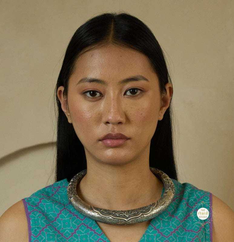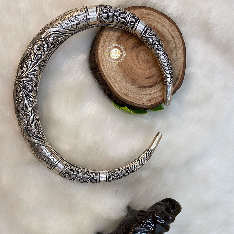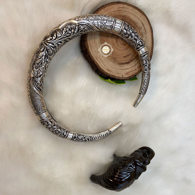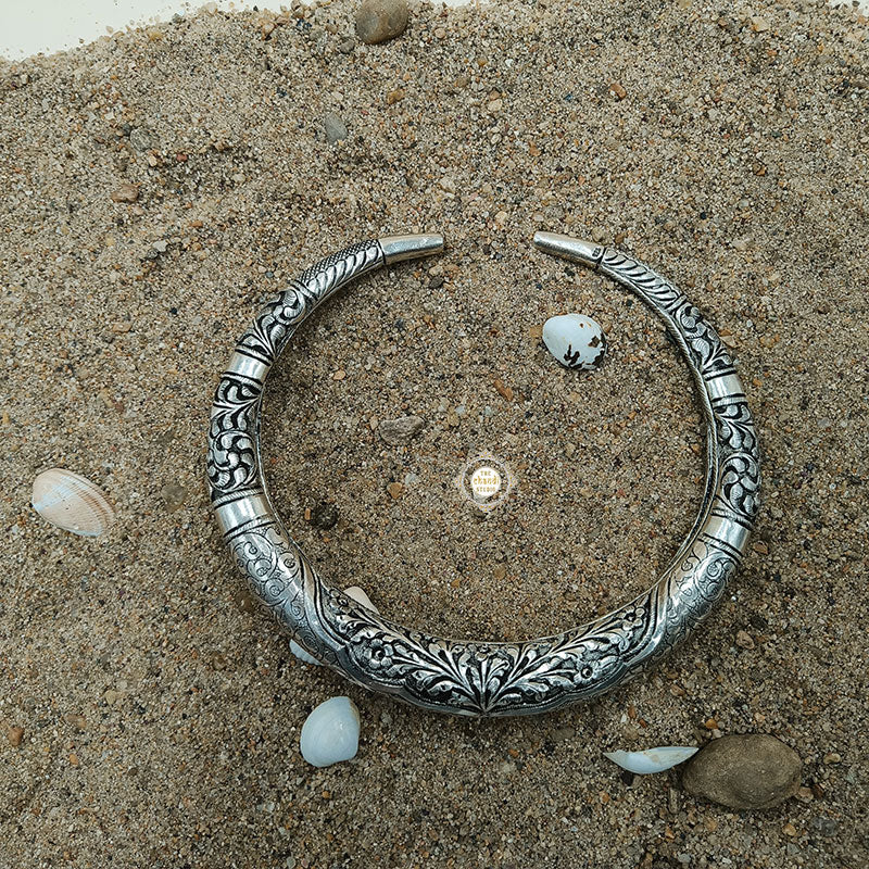 Exude the brilliance of old world charm with this finely crafted hasli with intricate traditional chitai art. MATERIAL – STERLING SILVER 92.5%