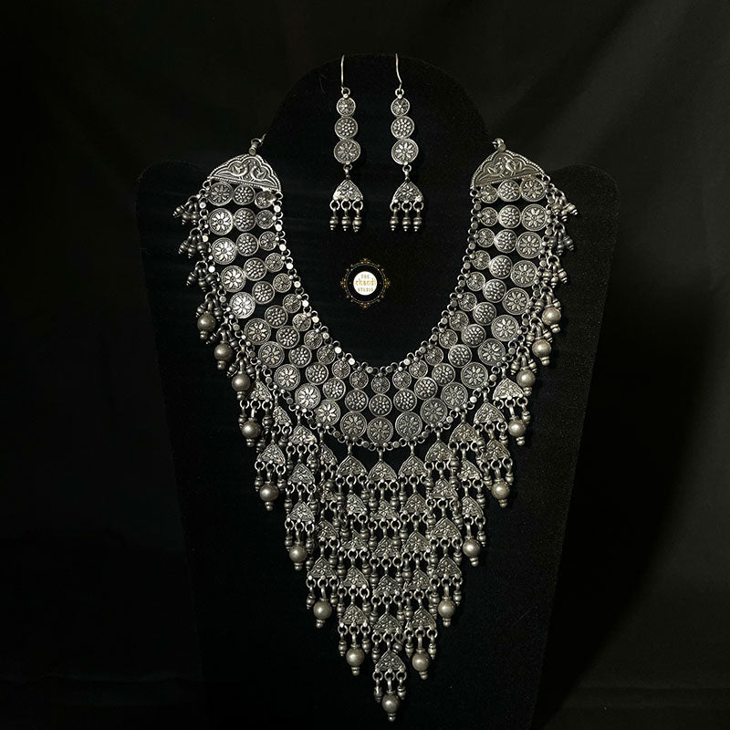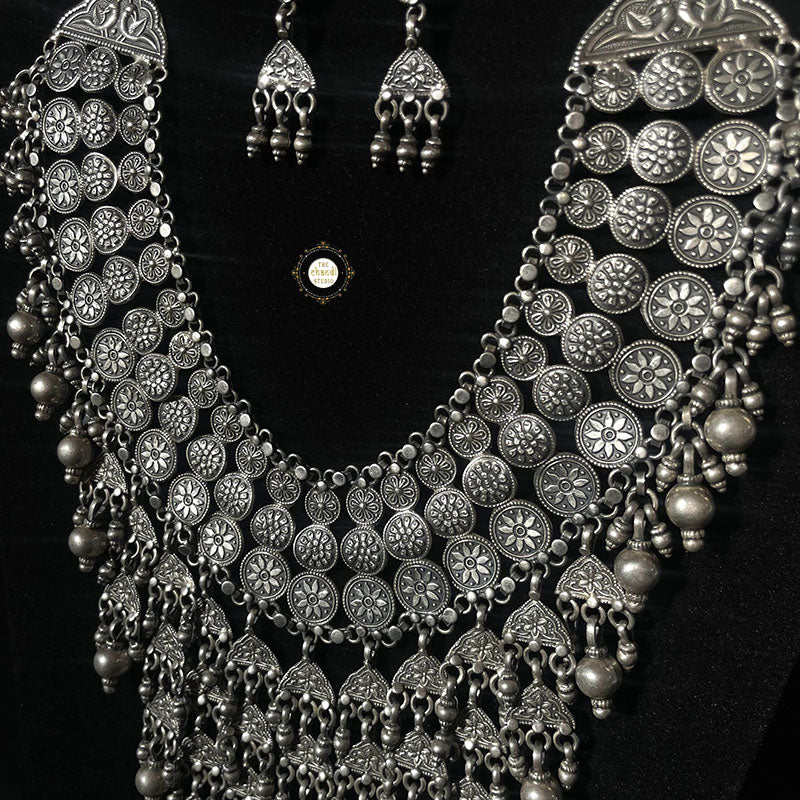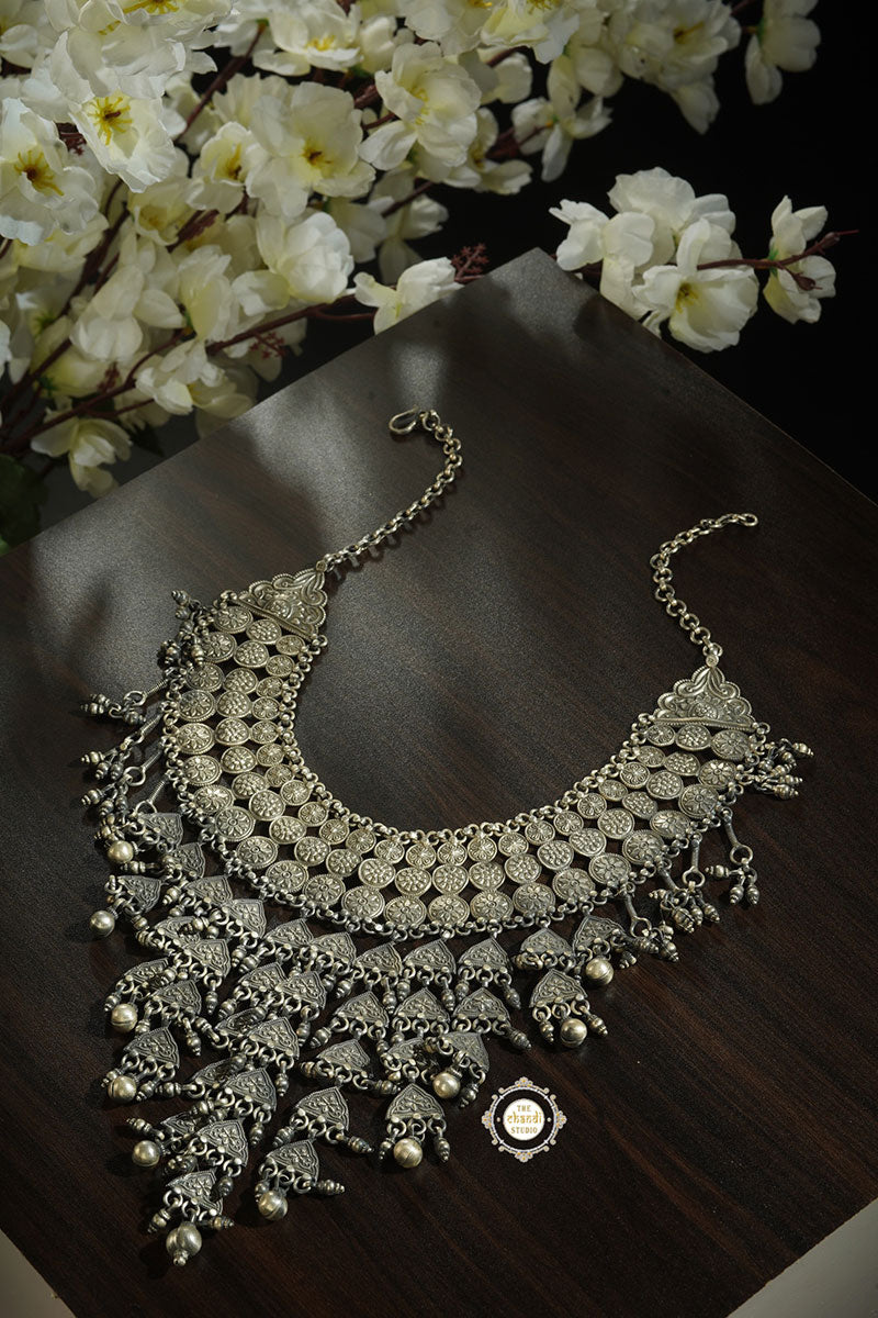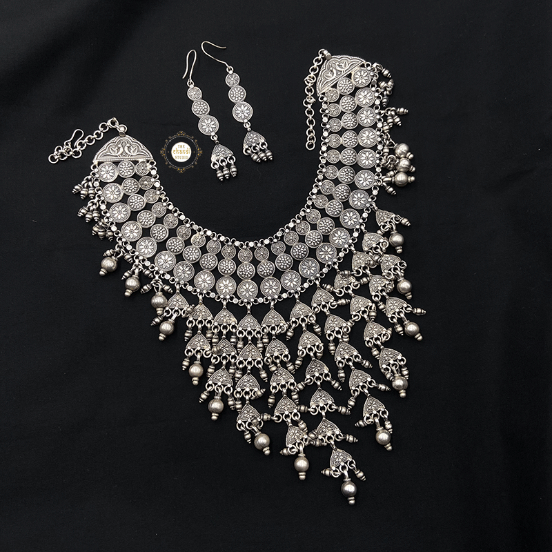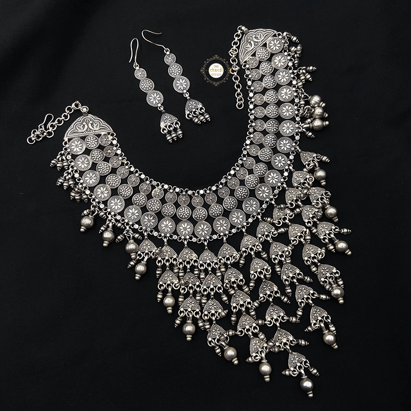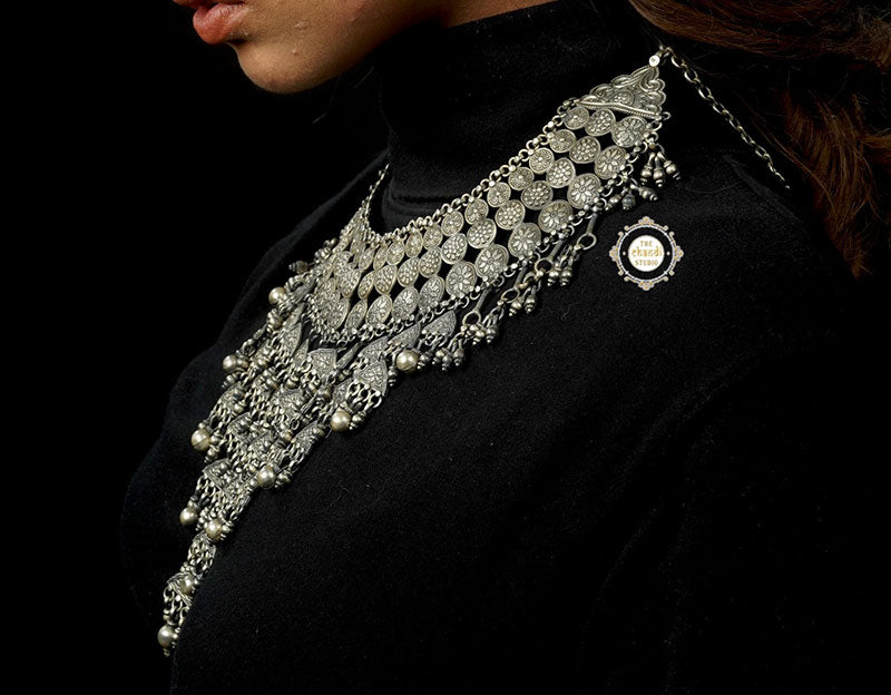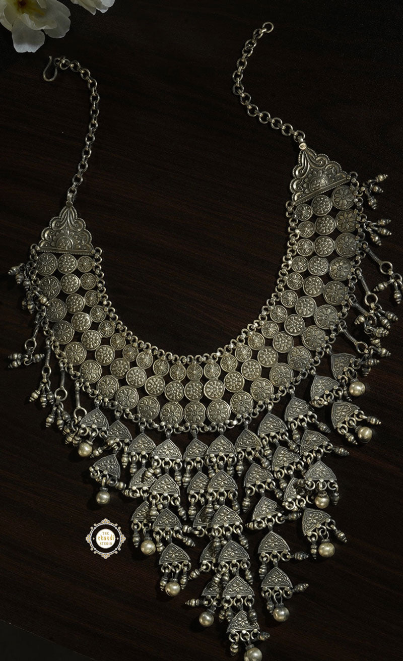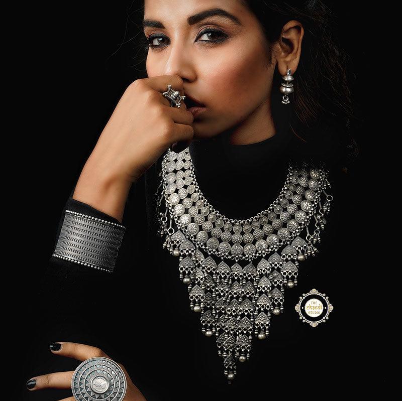 In this era of moving towards minimalism and subtle jewelry, we believe that the charm of decking up and going all OTT is still unmatched and hasn’t dwindled down entirely! This statement necklace has only one job – to make you feel like an empress. A dreamy layered piece that gives us legit maharani feels, isn’t it? Length : 11.5 inch of whole necklace Width : 8 inch Material: Sterling Silver 92.5
