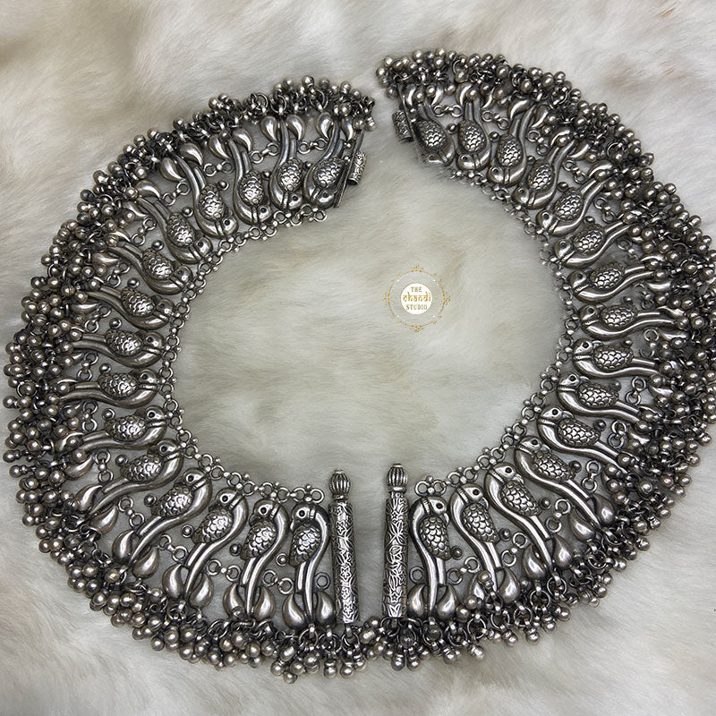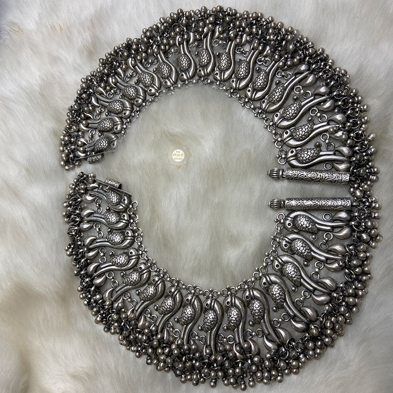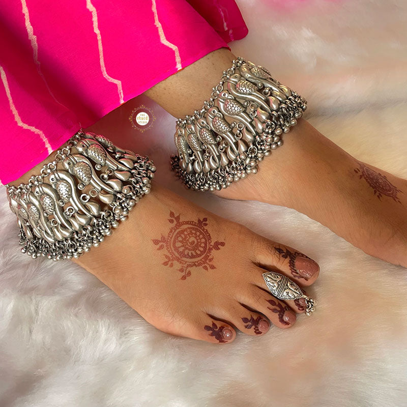 The Jashn Parrot Ghungroo Anklet is a perfect accessory for special occasions such as weddings, festivals, and cultural events. It beautifully complements traditional Indian attire like sarees, lehengas, and salwar suits. It's also a fantastic way to add an ethnic touch to your fusion and contemporary outfits. Elevate your fashion quotient and celebrate the spirit of Jashn (celebration) with the Jashn Parrot Ghungroo Anklet. Embrace the tradition, and let your feet dance to the melodious rhythm of these exquisite ghungroo bells. Material – Sterling Silver 92.5 Length : 8 Inch Width : 2.5 Inch