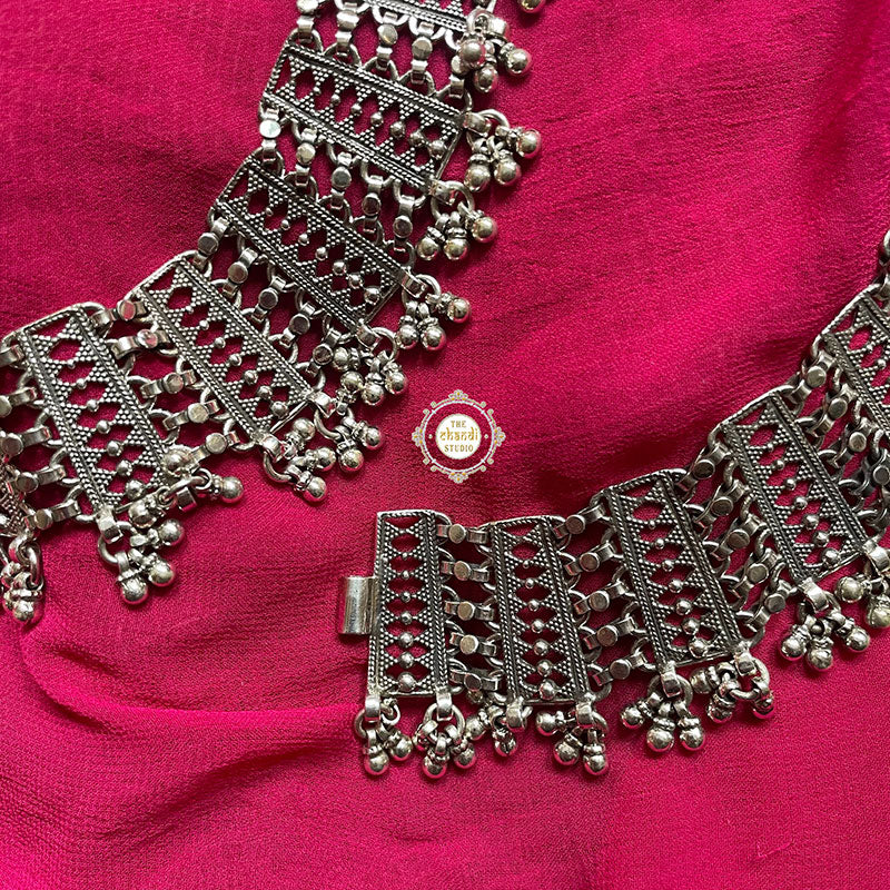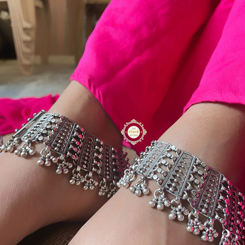 Jashn Rawa Ghungroo Anklet   Made up of rawa work and playful ghungroos, these anklets have grandeur and grace. Jashn Rawa Ghungroo Anklets are hard to miss and and are elegant accessories to dress your outfits with. Evening parties, wedding ceremonies, bridesmaid twinning, traditional occasions - these are perfect for adorning your feet. Don't forget to make your feet feel special! LENGTH : 10.75 inches * Price mentioned is for a Pair. * Material – Sterling Silver 925