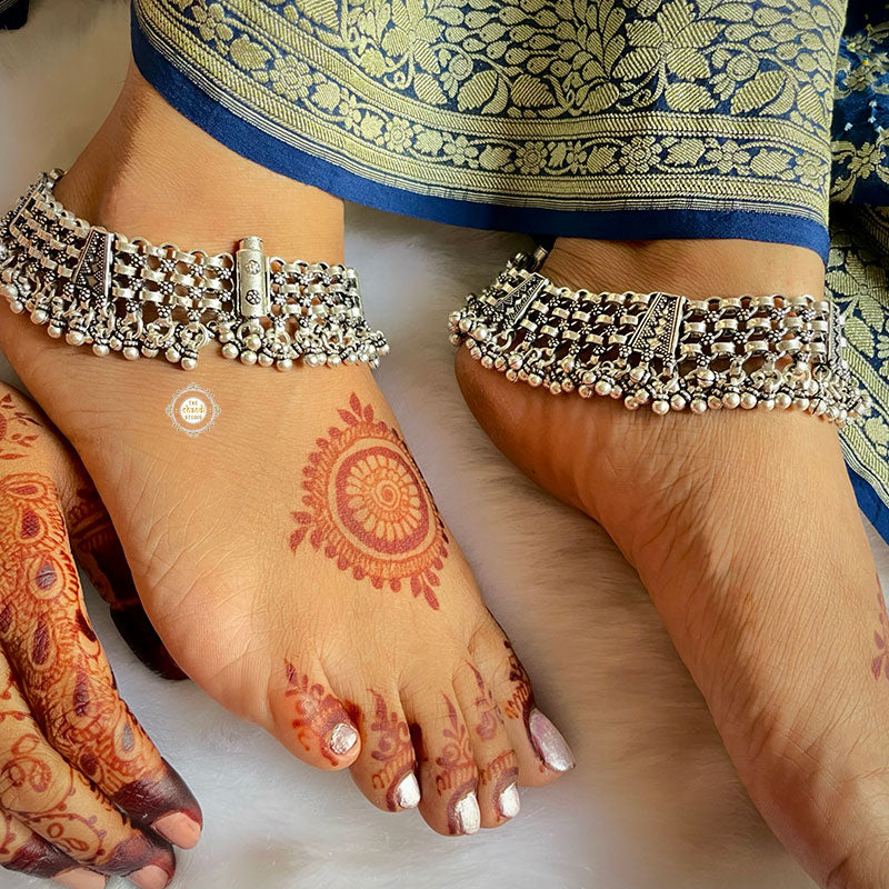 Made up of rawa work and playful ghungroos, these anklets have grandeur and grace. Jashn Rawa Ghungroo Anklets are hard to miss and and are elegant accessories to dress your outfits with. Evening parties, wedding ceremonies, bridesmaid twinning, traditional occasions – these are perfect for adorning your feet. Don’t forget to make your feet feel special!   MATERIAL : STERLING SILVER 92.5 *Price mentioned is for a pair.
