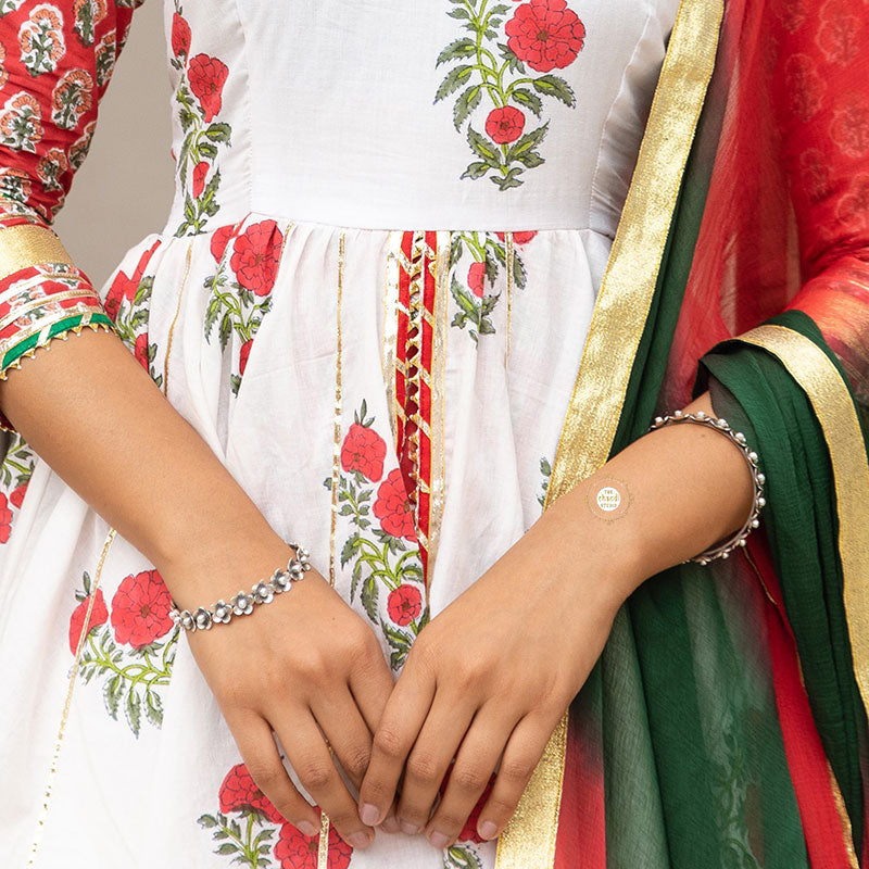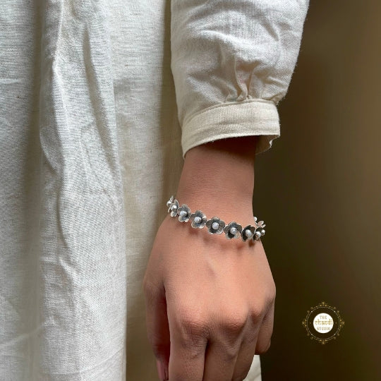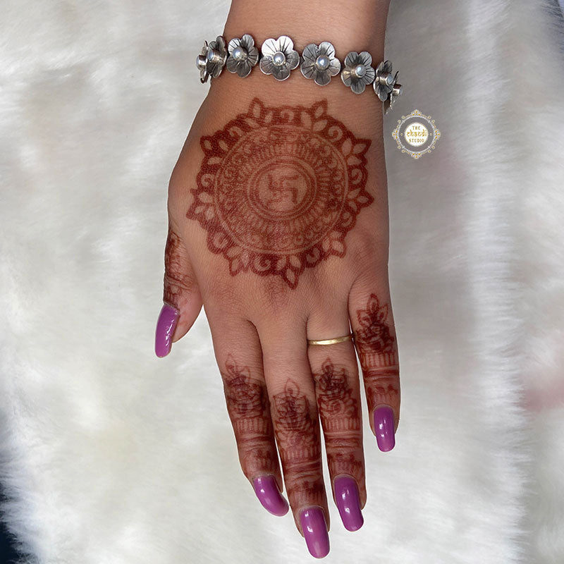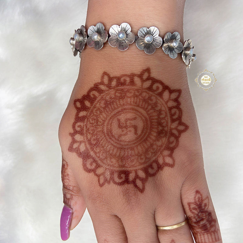JASMINE PEARL BANGLE: What if your wedding lehenga narrated your love story? Yes! My haldi lehenga depicted my love for silver jewellery to a level that my entire ensemble was made from tiny silver motifs like bird, lotus, fish, butterflies, rose etc.
