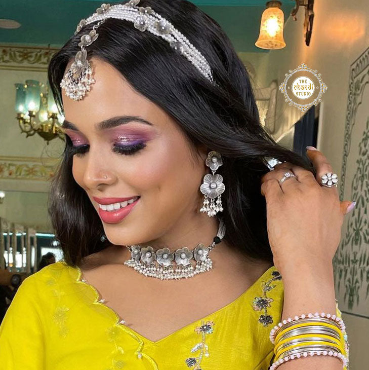 What if your wedding lehenga narrated your love story? Yes! My haldi lehenga depicted my love for silver jewellery to a level that my entire ensemble was made from tiny silver motifs like bird, lotus, fish, butterflies, rose etc. Until now, lehengas were just outfits. But for me, it went far beyond just style. This is now the piece of artwork that unfolds not just my persona, but my memories and meaningful experiences with my work. The Chandi Studio has been a beautiful Jasmine Pearl Earring & the most hard working journey for me & I thought of translating this milestone onto one of my wedding outfit. Watching this piece come to life felt like a therapy session. It was worth all the effort & pain because the end product had everyone captivated. And today my lehenga not just sits in my closet, but stands as a special piece of artwork and beautiful memoir 💛   * Price mentioned is for Earring only * Material – Sterling Silver 925