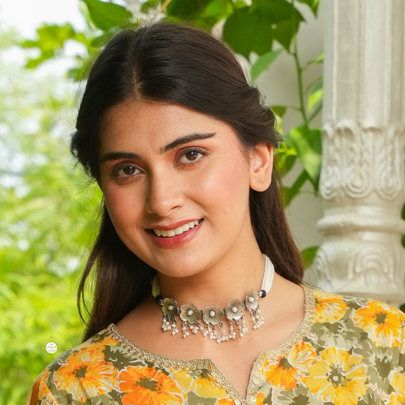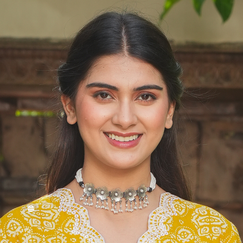 Jasmine Pearls of Joy Necklace   What if your wedding lehenga narrated your love story? Yes! My haldi lehenga depicted my love for silver jewellery to a level that my entire ensemble was made from tiny silver motifs like bird, lotus, fish, butterflies, rose etc. Until now, lehengas were just outfits. But for me, it went far beyond just style. This is now the piece of artwork that unfolds not just my persona, but my memories and meaningful experiences with my work. The Chandi Studio has been a beautiful & the most hard working journey for me & I thought of translating this milestone onto one of my wedding outfit. Watching this piece come to life felt like a therapy session. It was worth all the effort & pain because the end product had everyone captivated. And today my lehenga not just sits in my closet, but stands as a special piece of artwork and beautiful memoir 💛   * Price mentioned is for Necklace only * Material – Sterling Silver 925