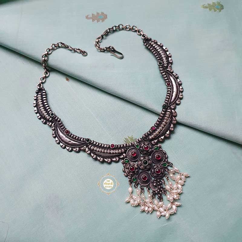 Festive & artistic at the same time, this Kolhapuri Necklace Set with freshwater pearls celebrates beauty in an impressive way. Such intricate & clean work by our talented karigars! Necklace Length – 6' Inch Width – 2' Inch Length of Links- 6.5' Inches Earring Weight - 14 gm Length - 2' Inches Width - 1' Inches *Price is inclusive of Earring MATERIAL : Sterling Silver 92.5
